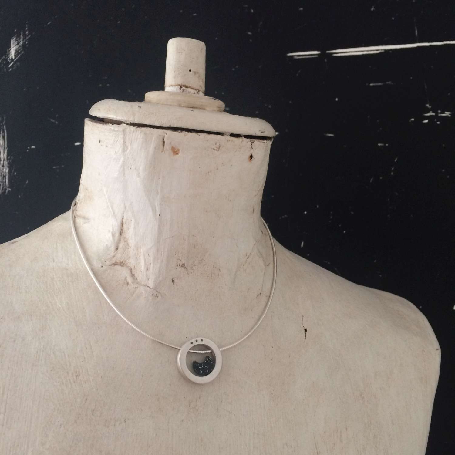The necklace is made of 925 sterling silver with tiny black diamonds and a moon-shaped black glittering plexiglass.
