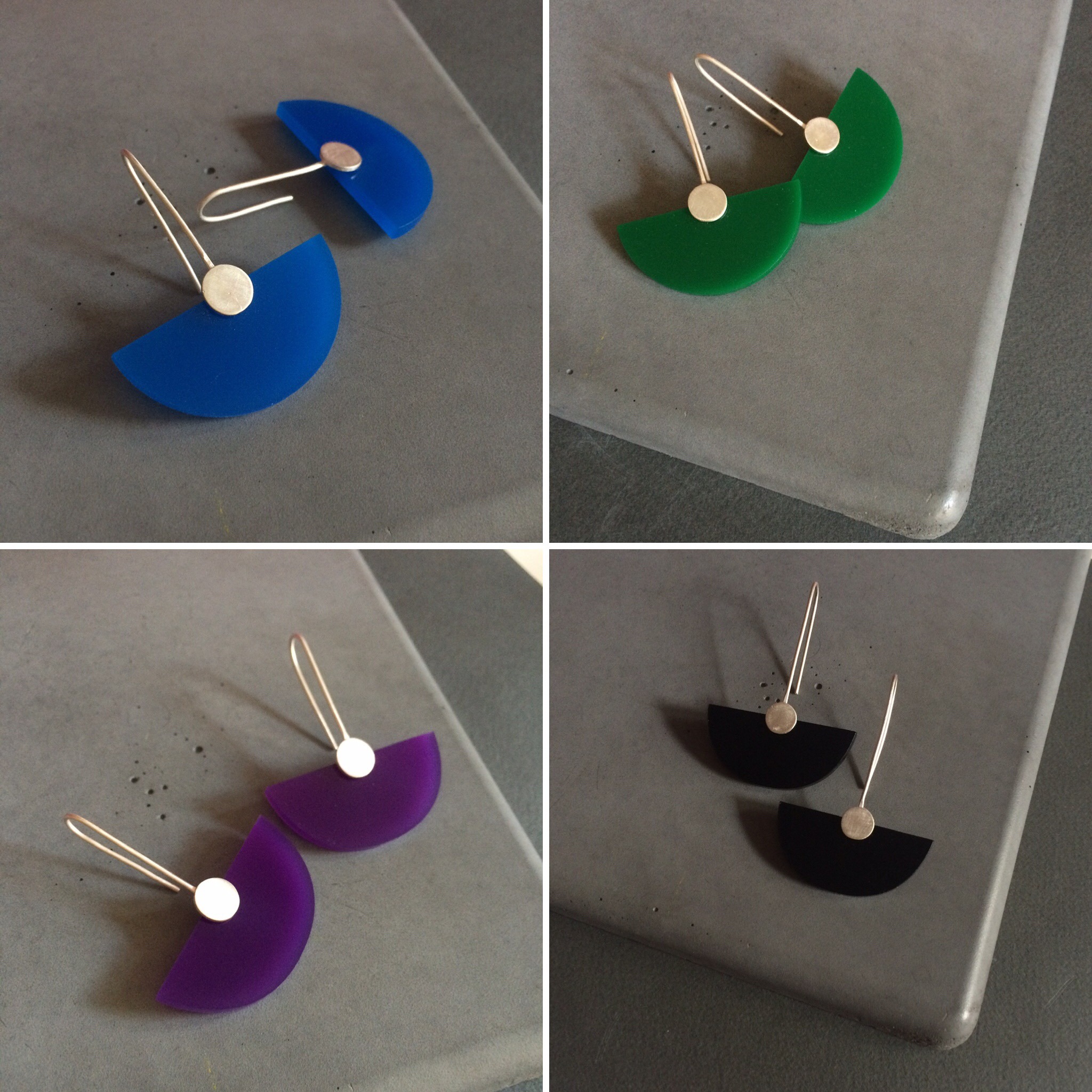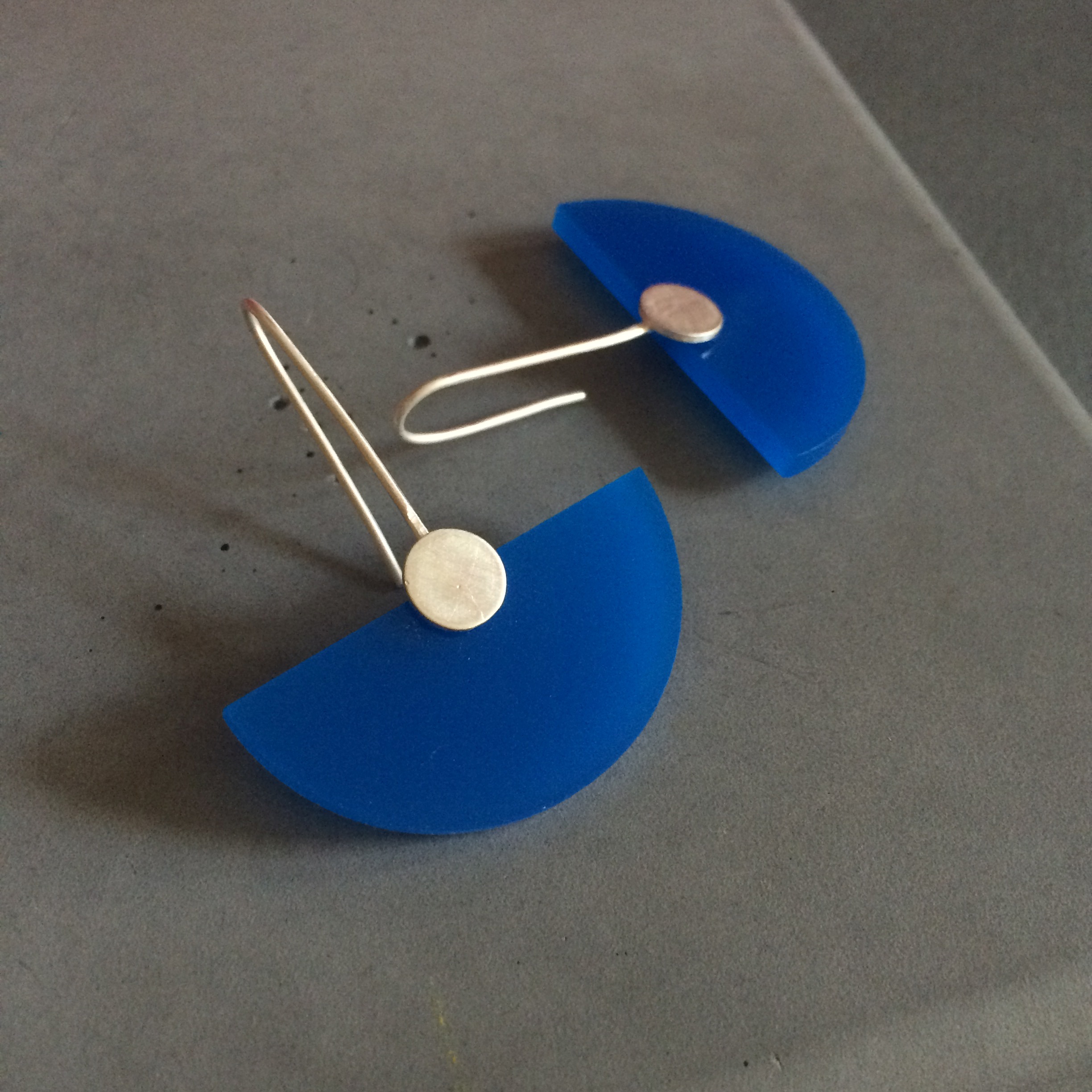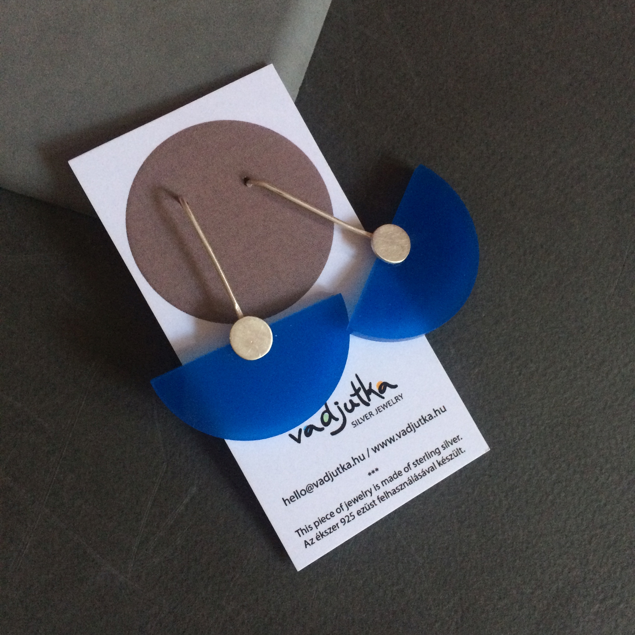 Made of 925 sterling silver with a blue, half-circle plexiglass element.