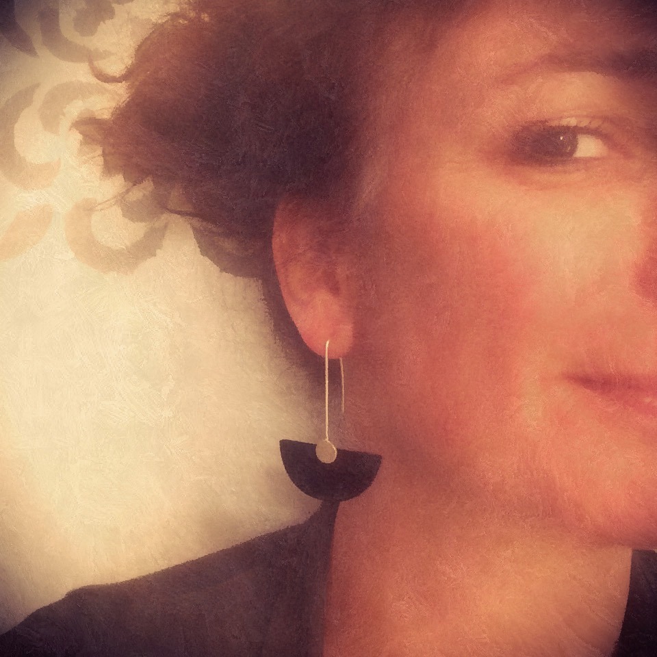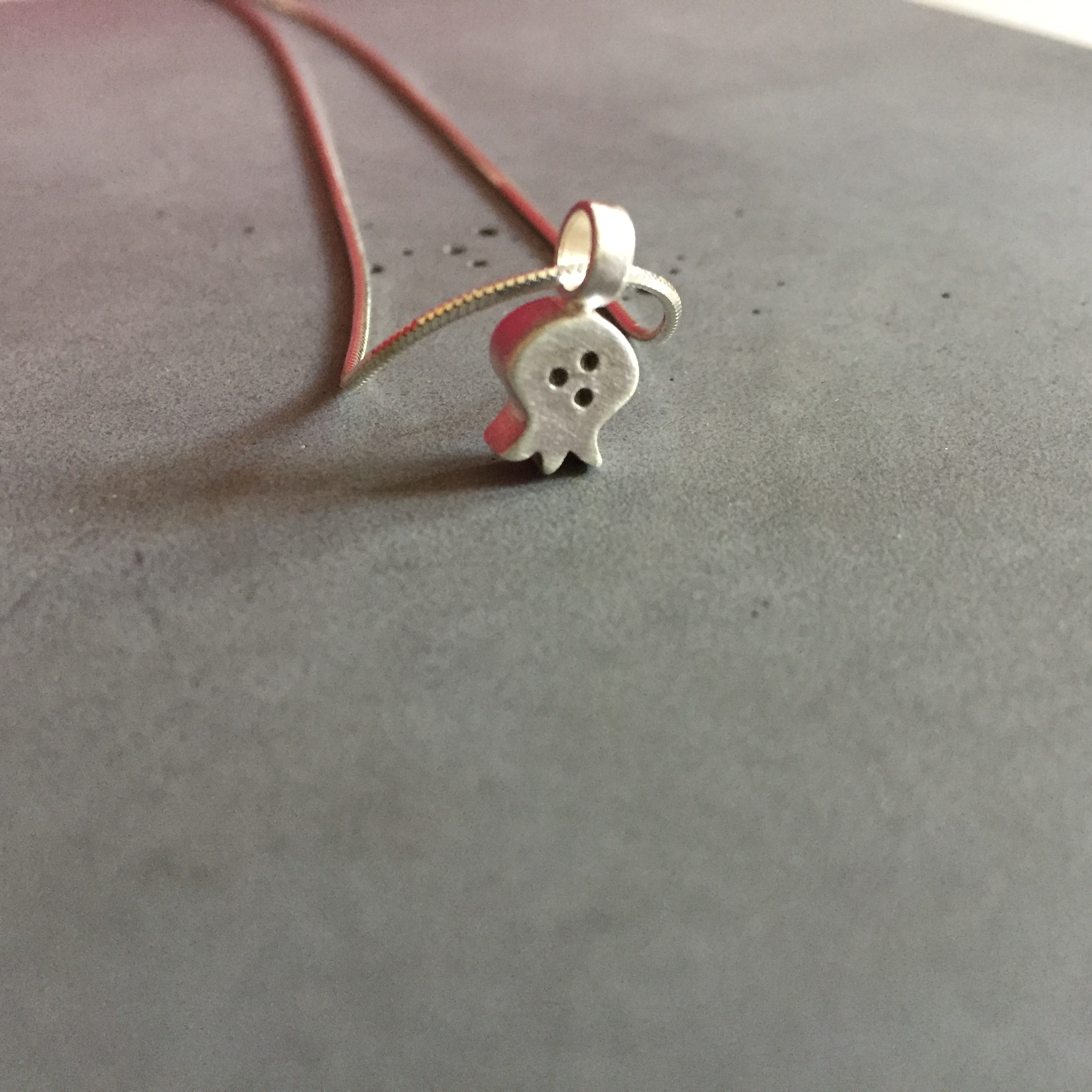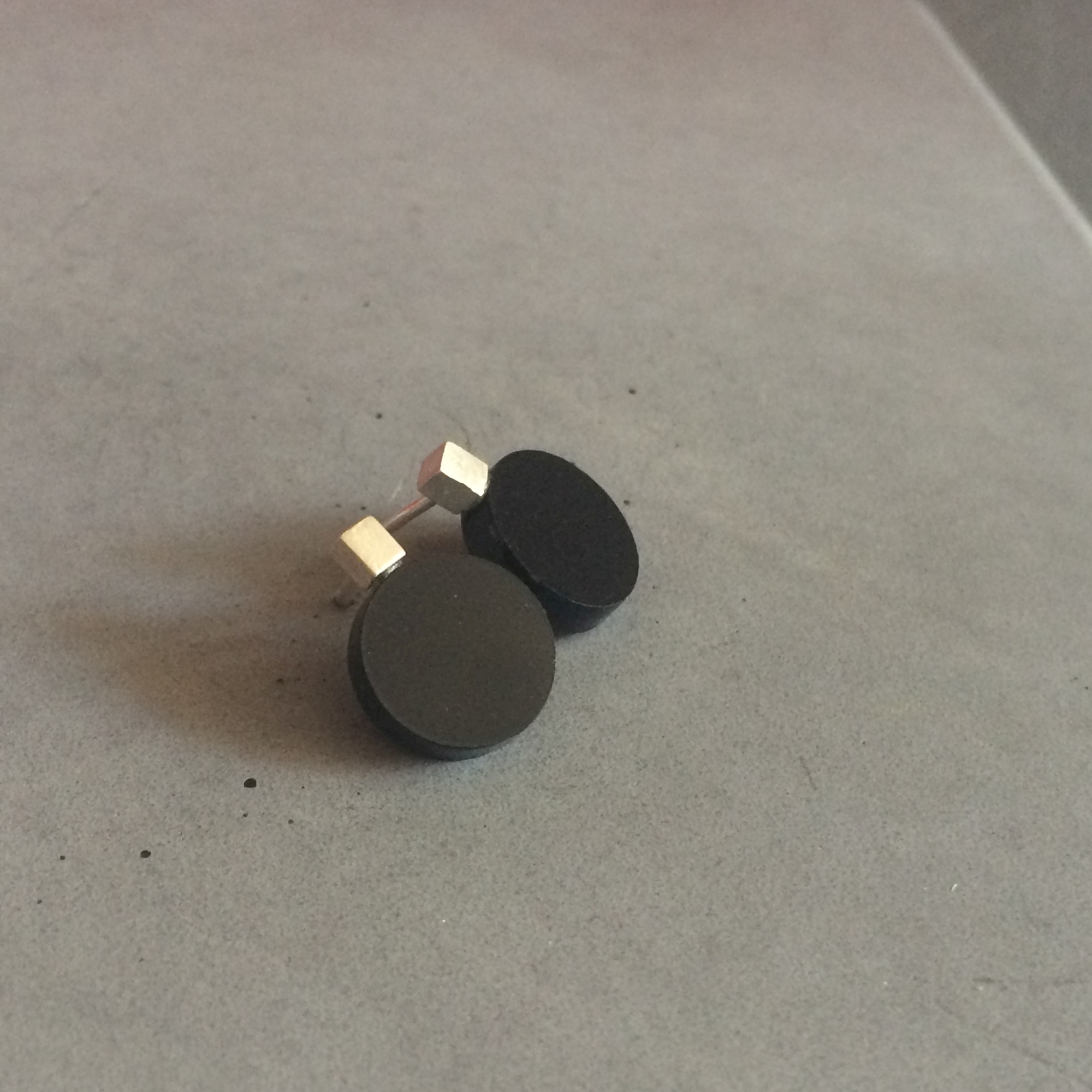Made of 925 sterling silver with a blue, half-circle plexiglass element.