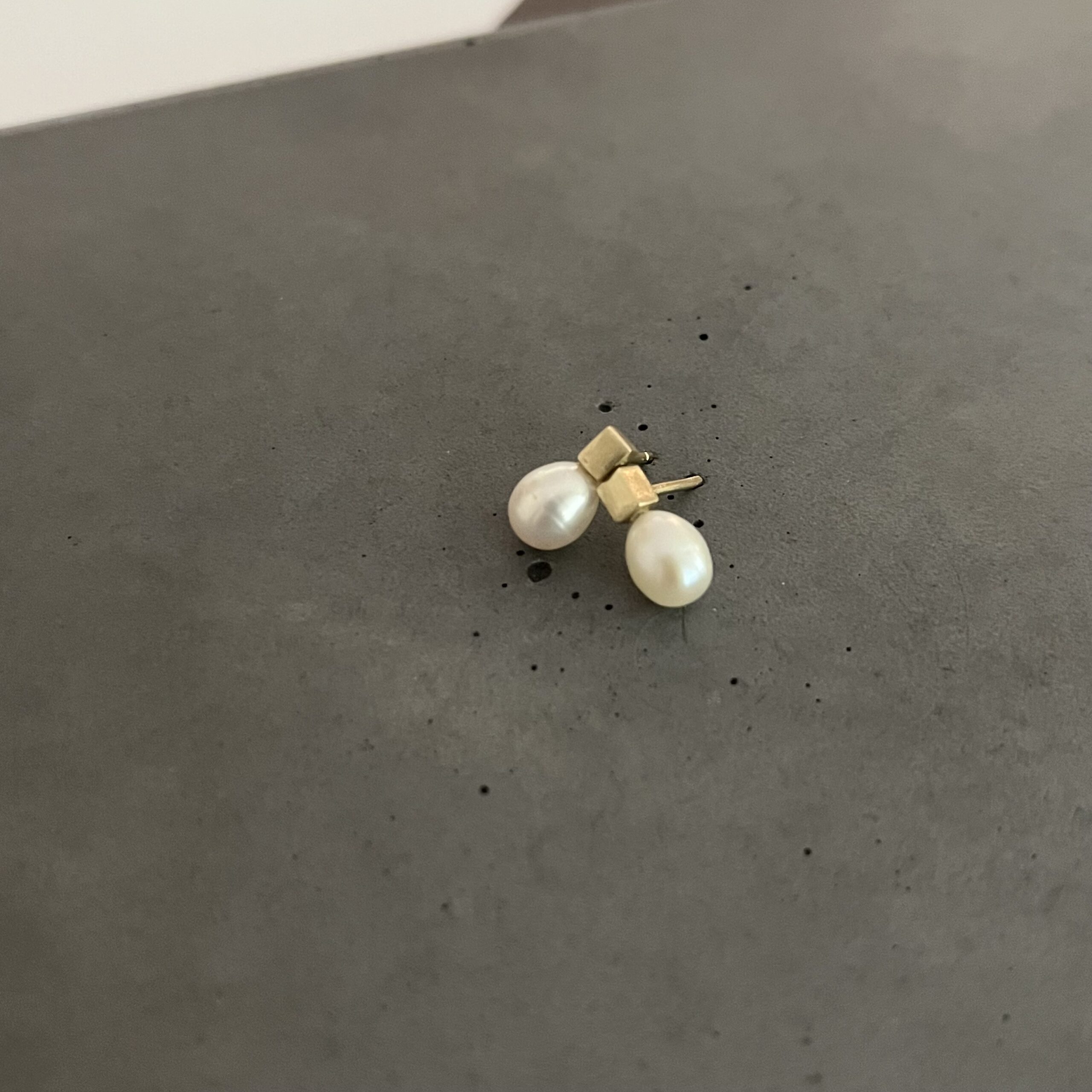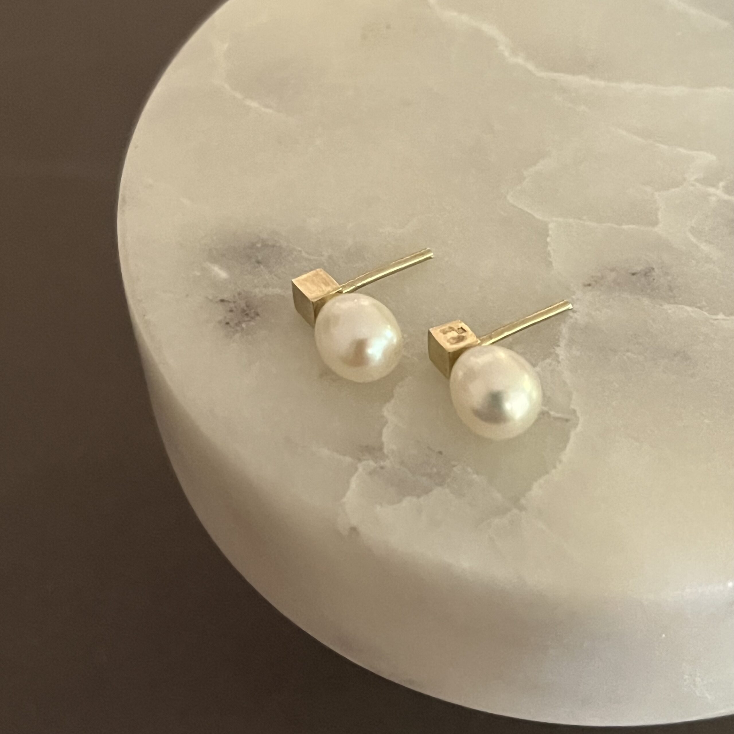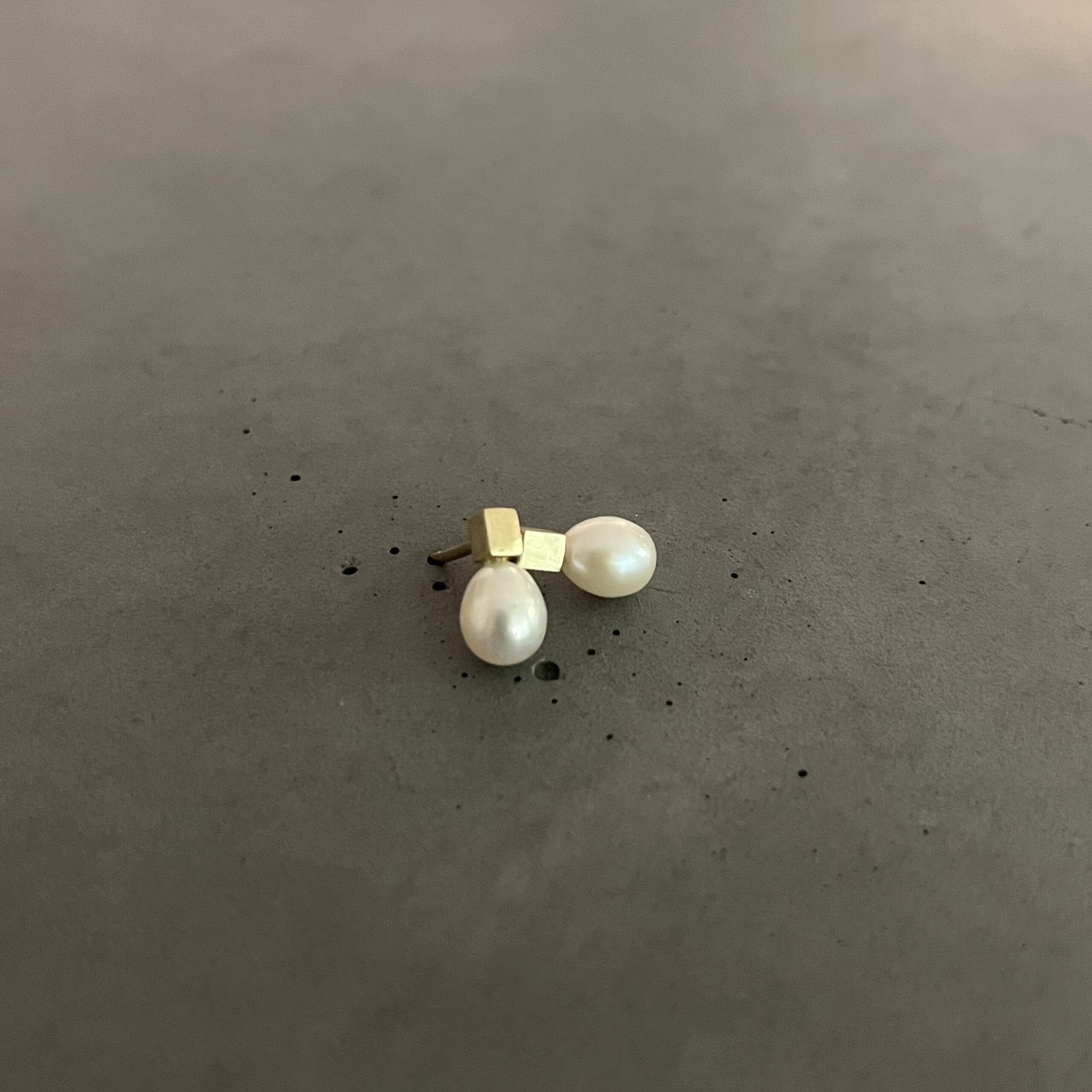 These tiny gold stud earrings are both classic and modern, consisting of a small cube and a teardrop-shaped freshwater pearl.