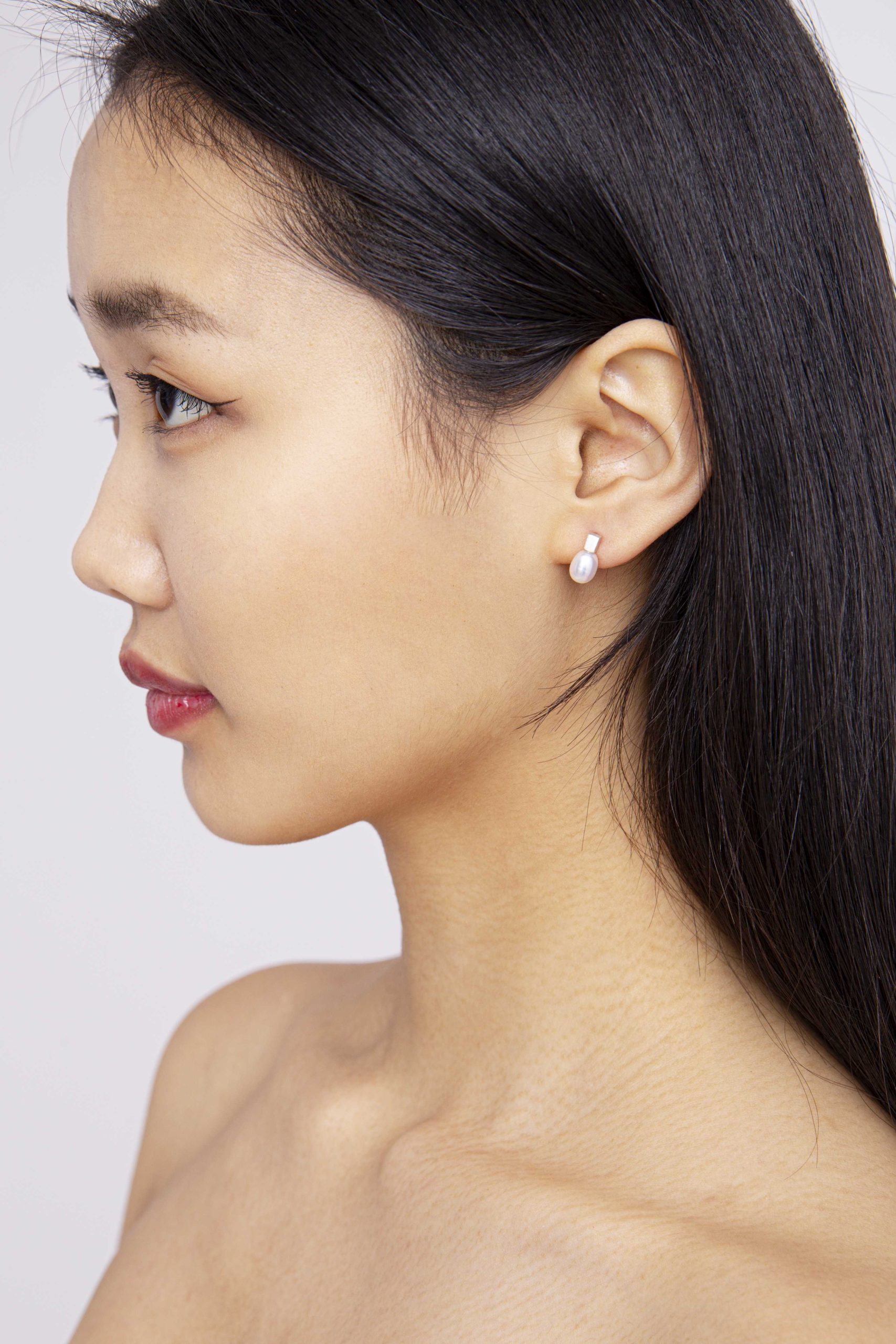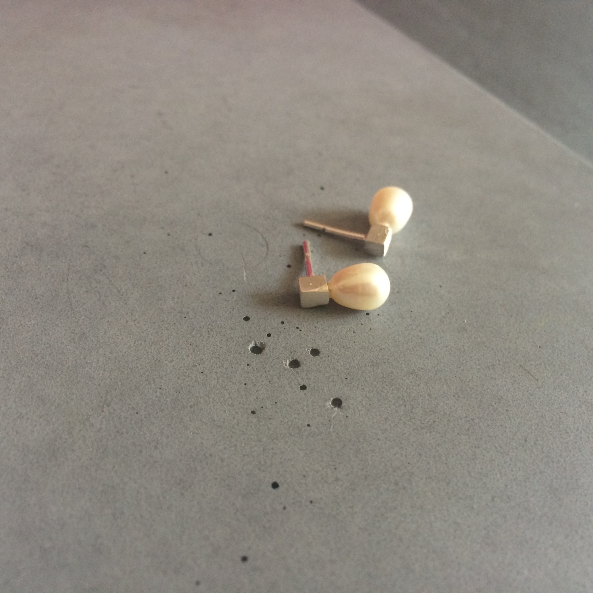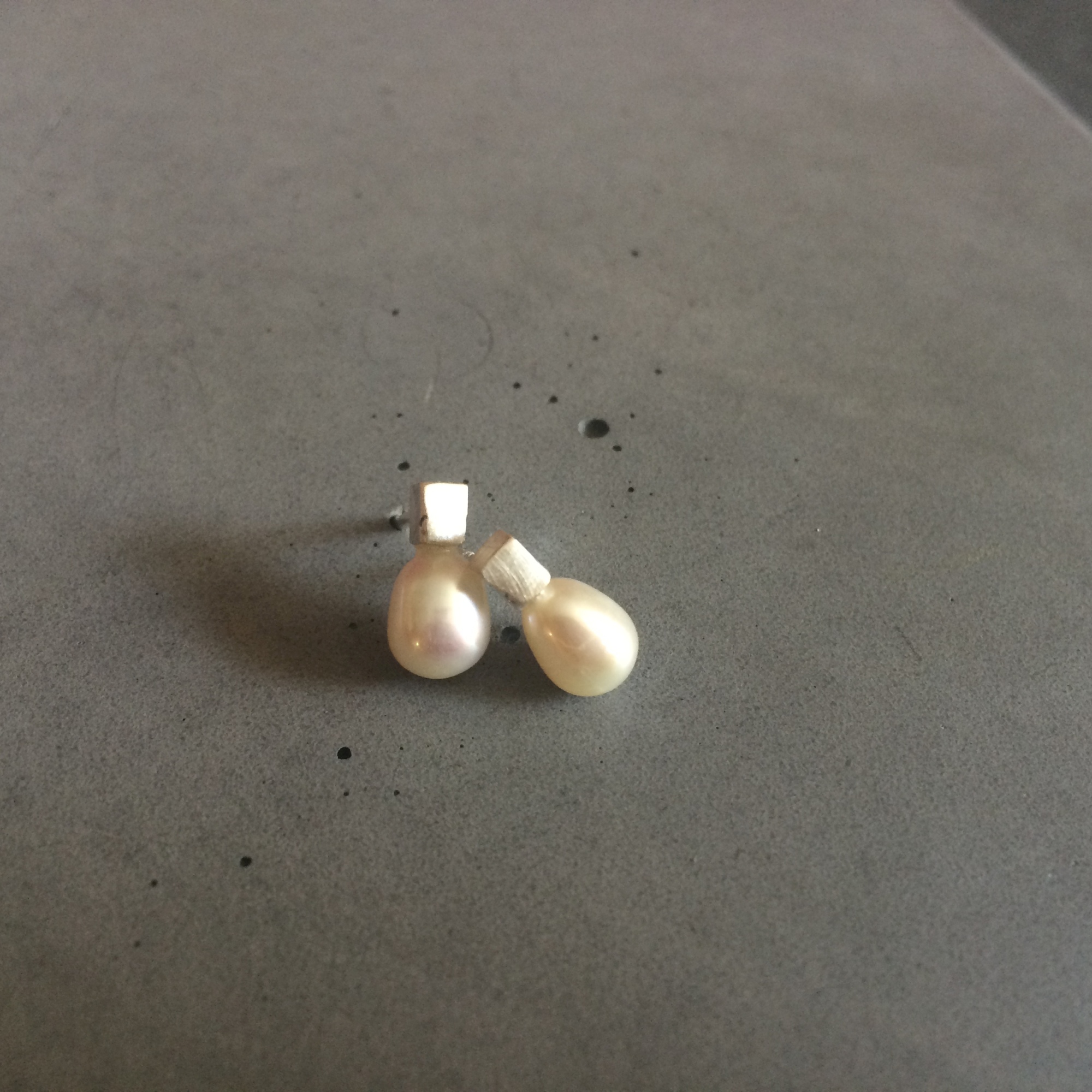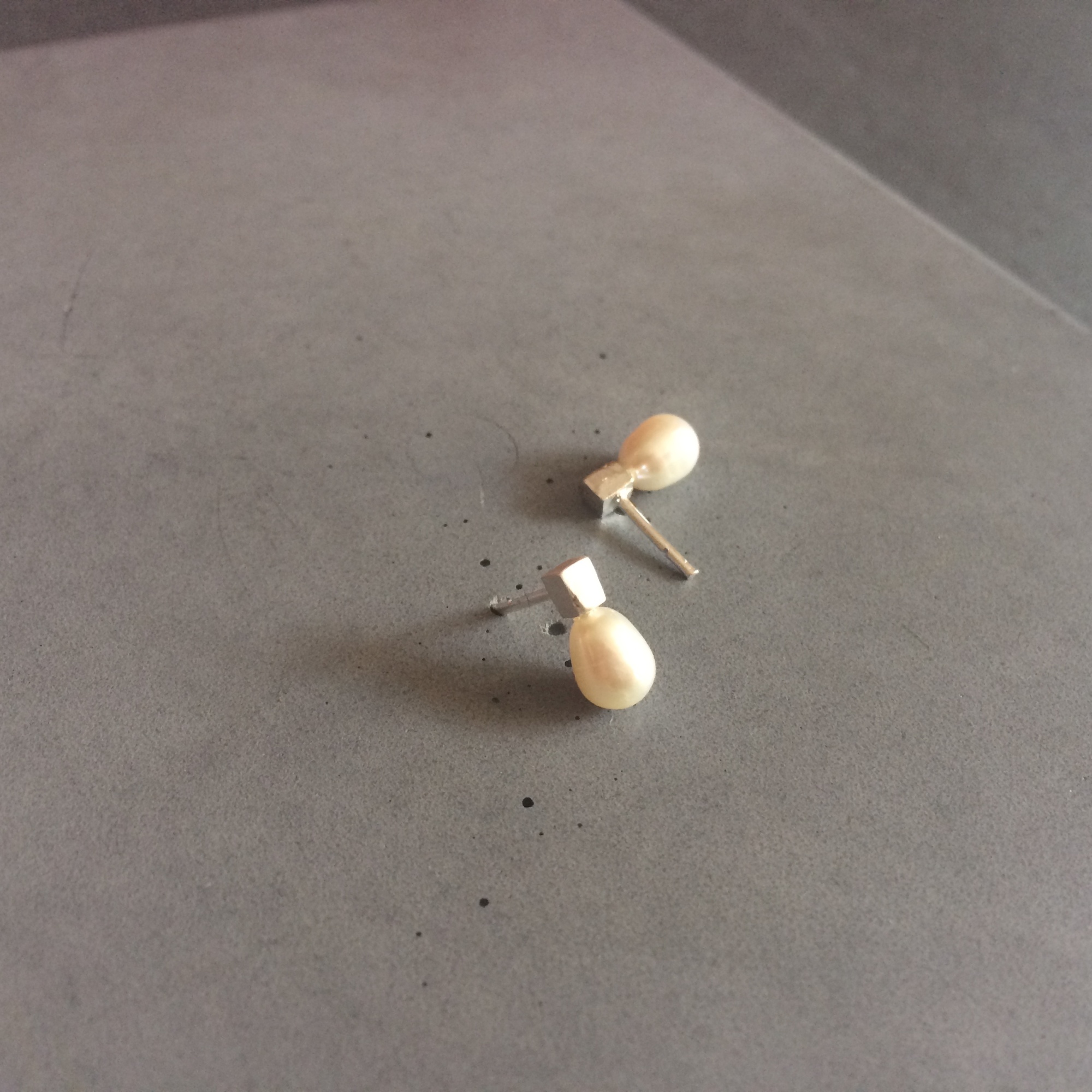 These tiny silver stud earrings are both classic and modern, consisting of a small cube and a teardrop-shaped freshwater pearl. The earrings are made of 925 sterling silver.