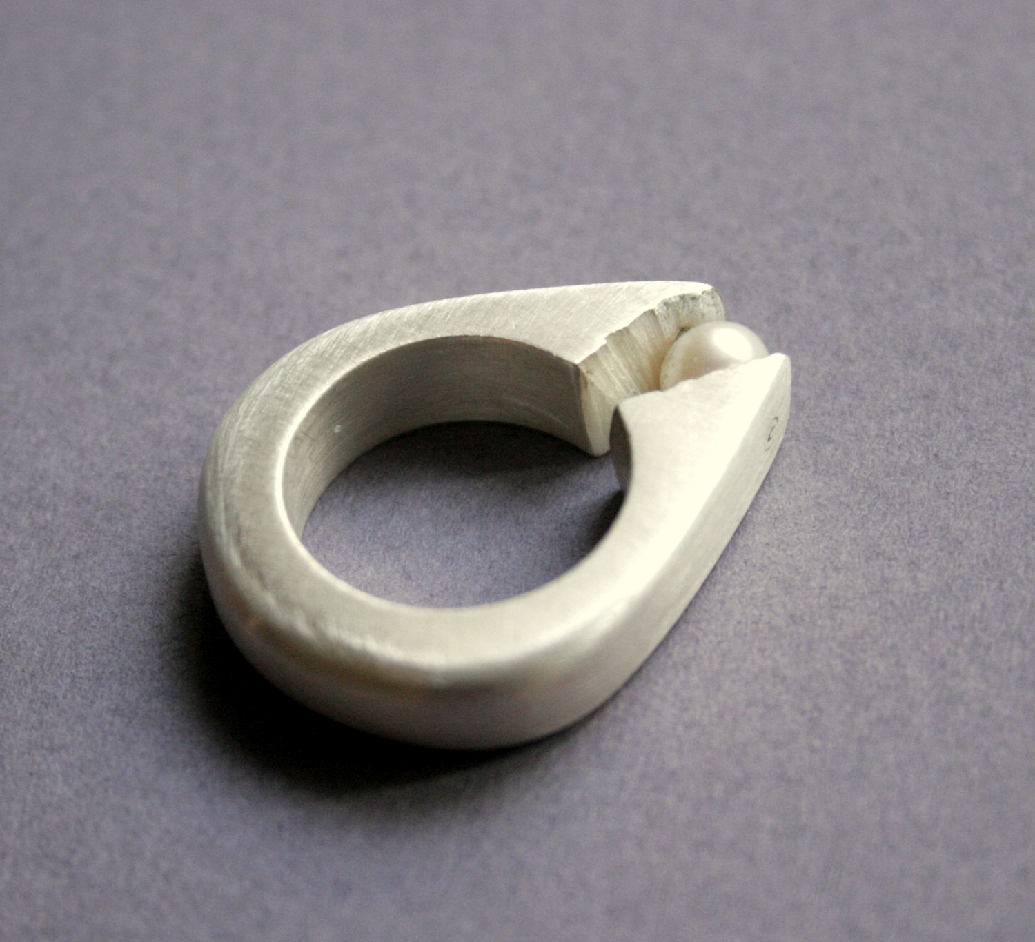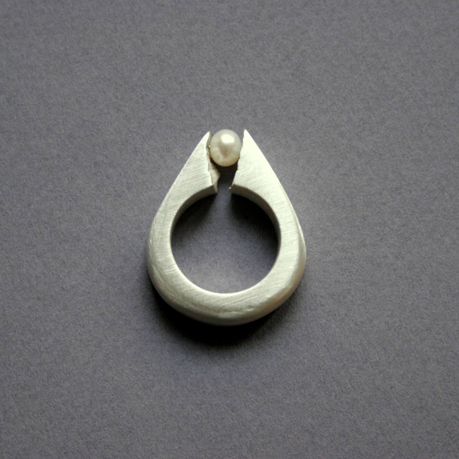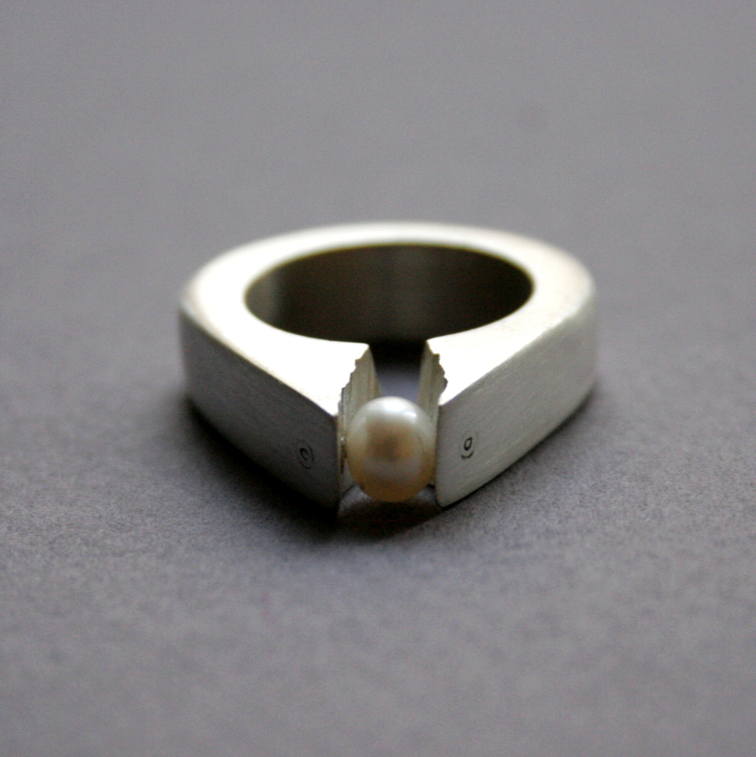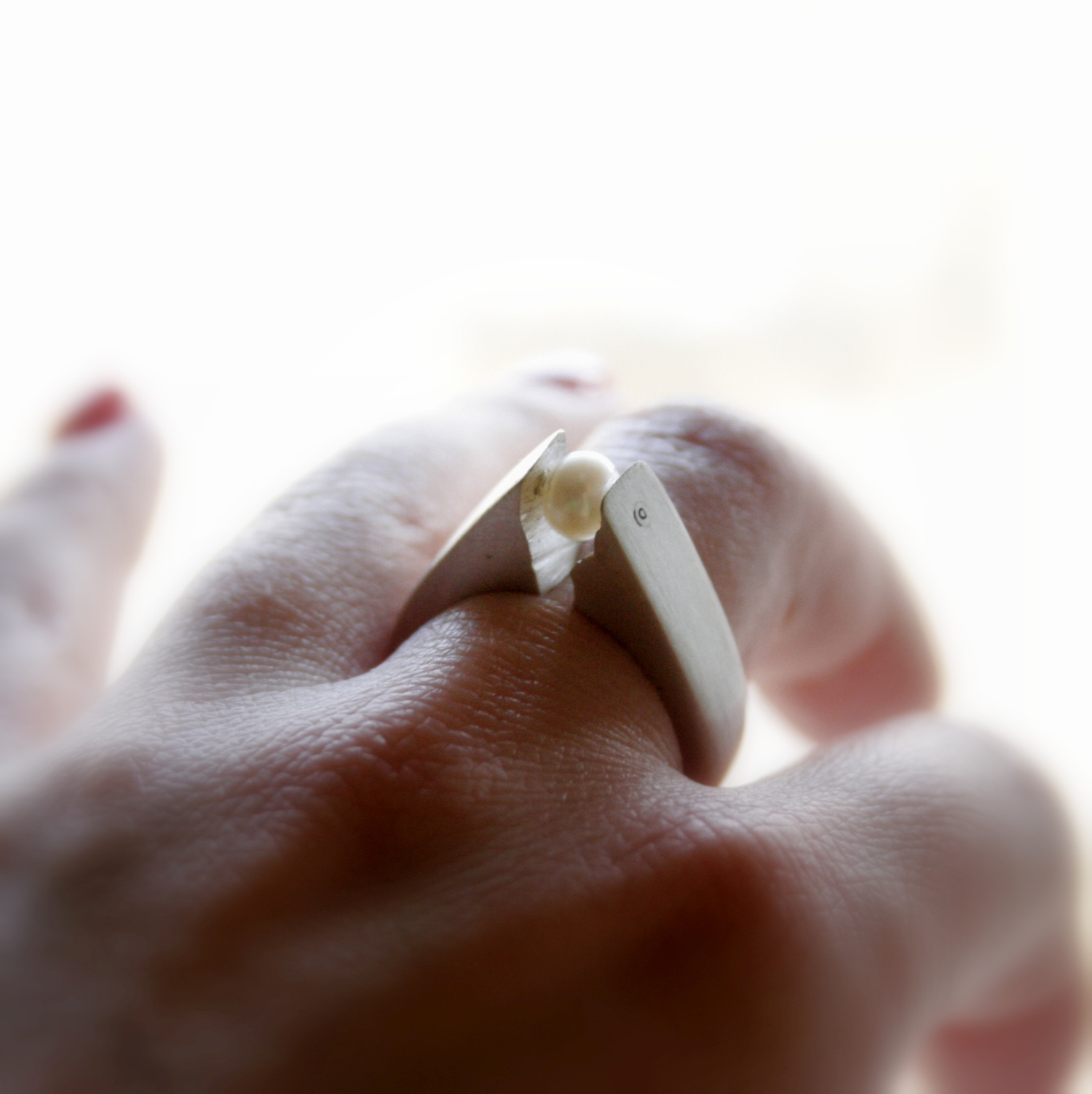 A so-called statement ring: a ring made of 925 fine silver with a “gap” in the middle, which is “bridged” by a white cultured pearl. The weight of the ring is 7-10 grams, depending on the size.