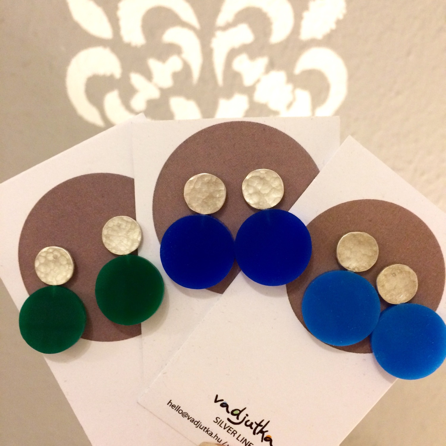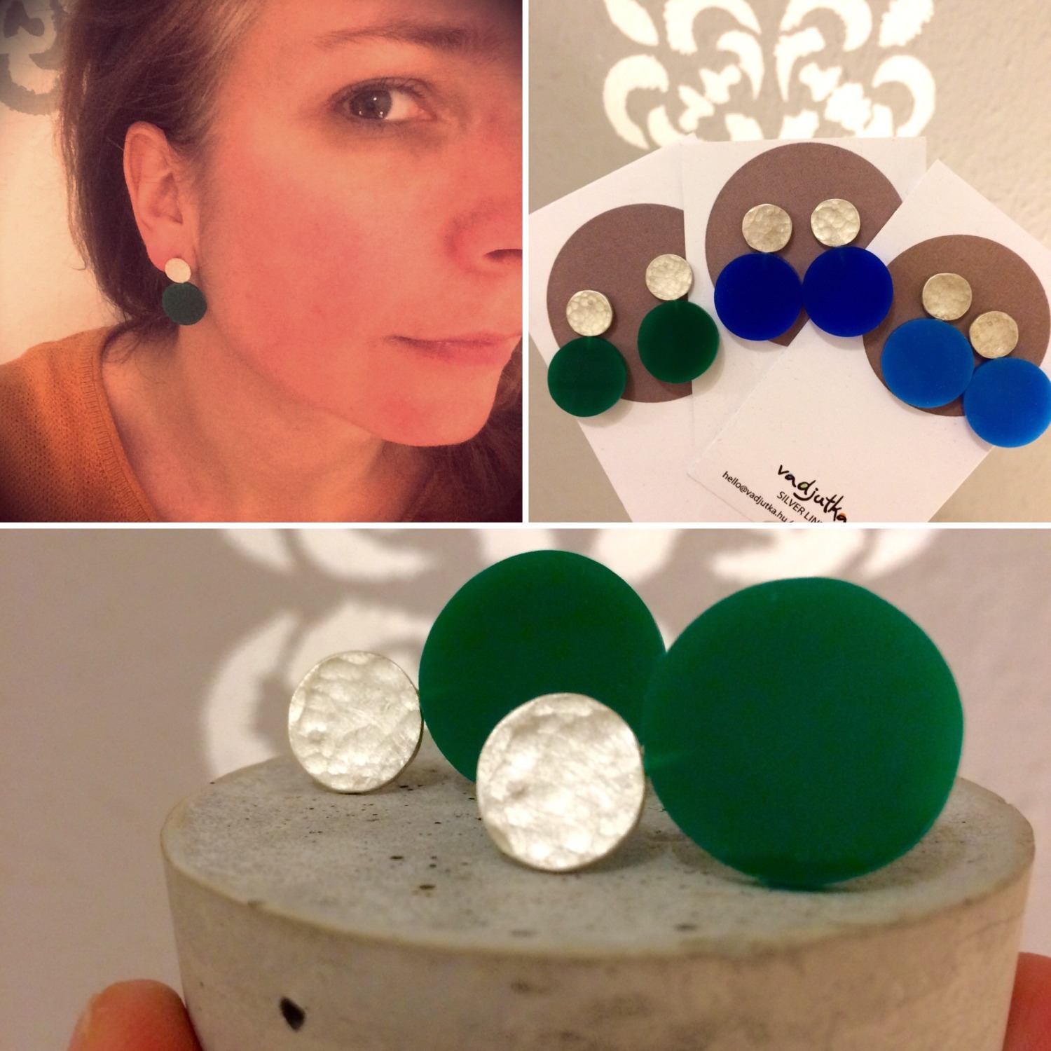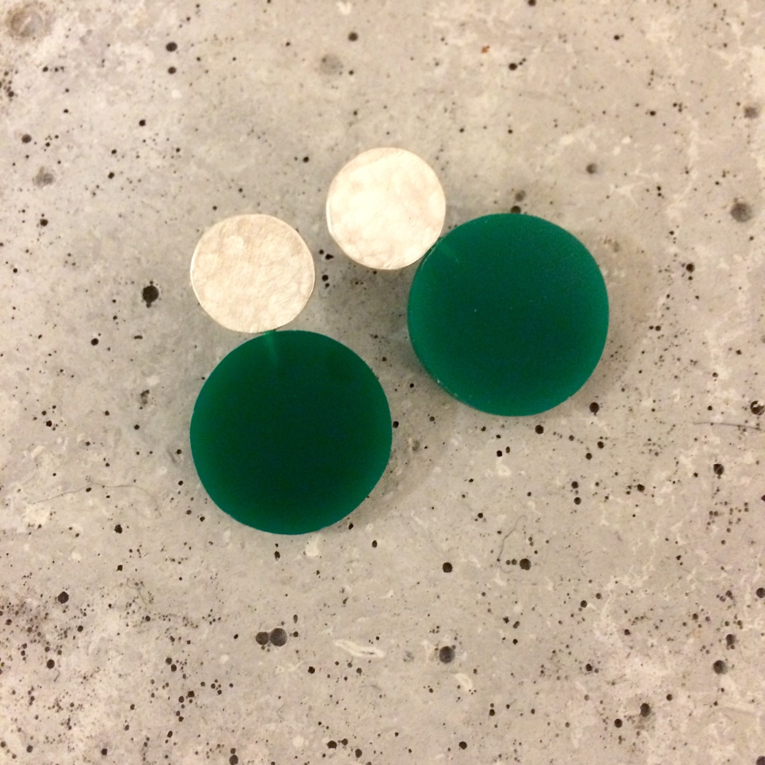 These earrings are made of 925 sterling silver with green plexiglass and a rustic silver surface.
