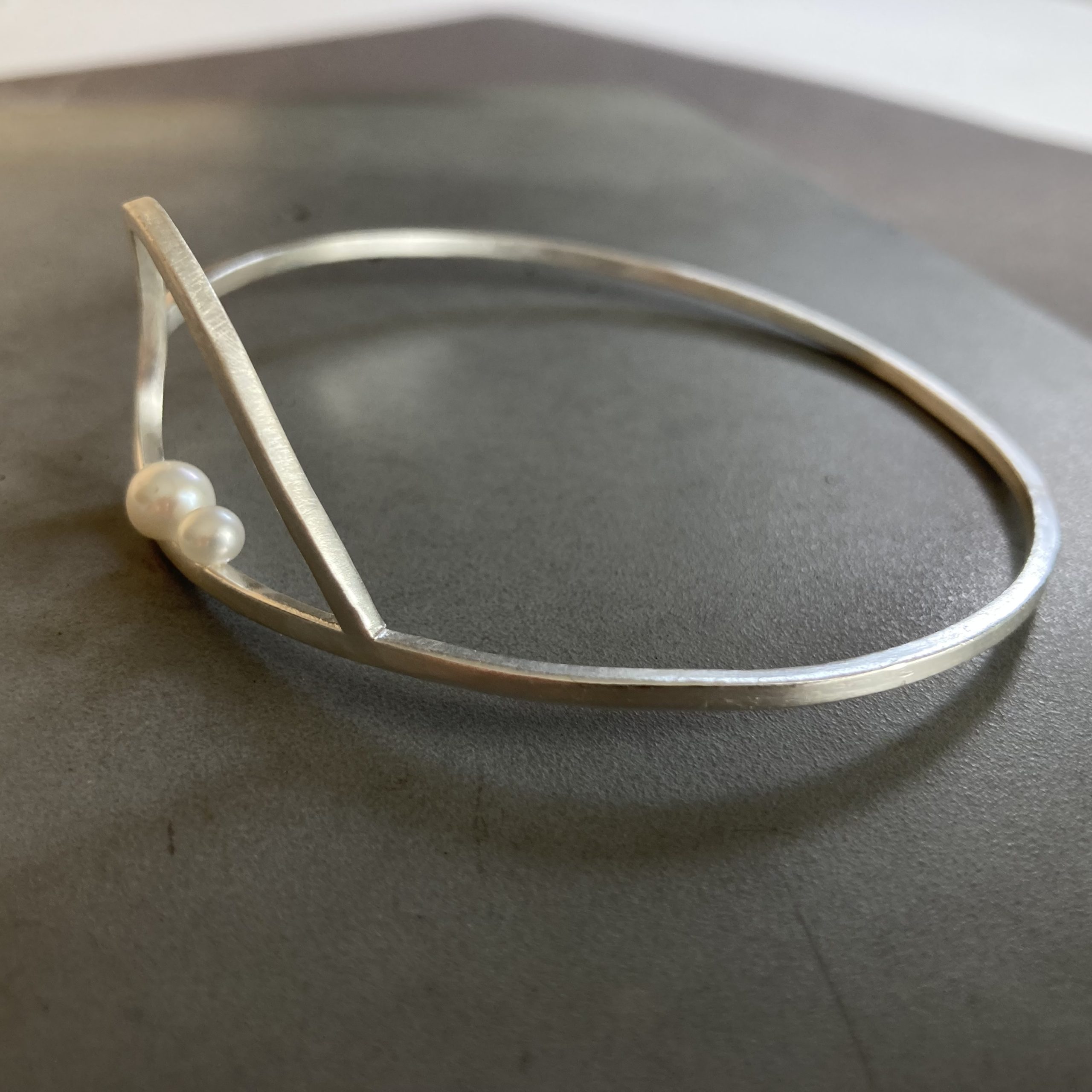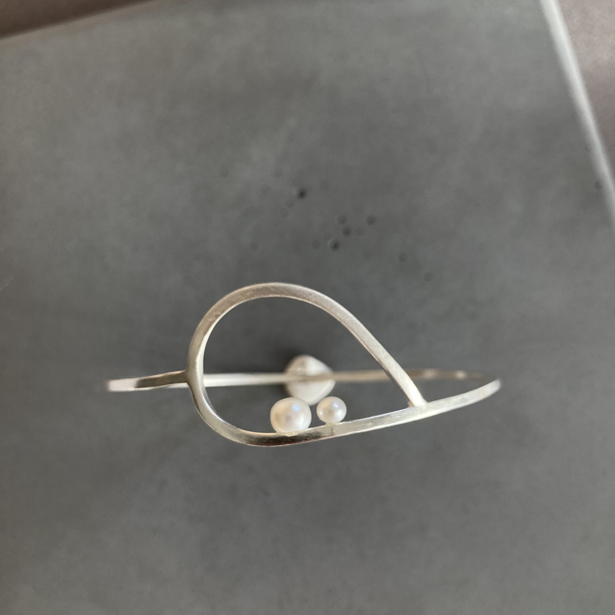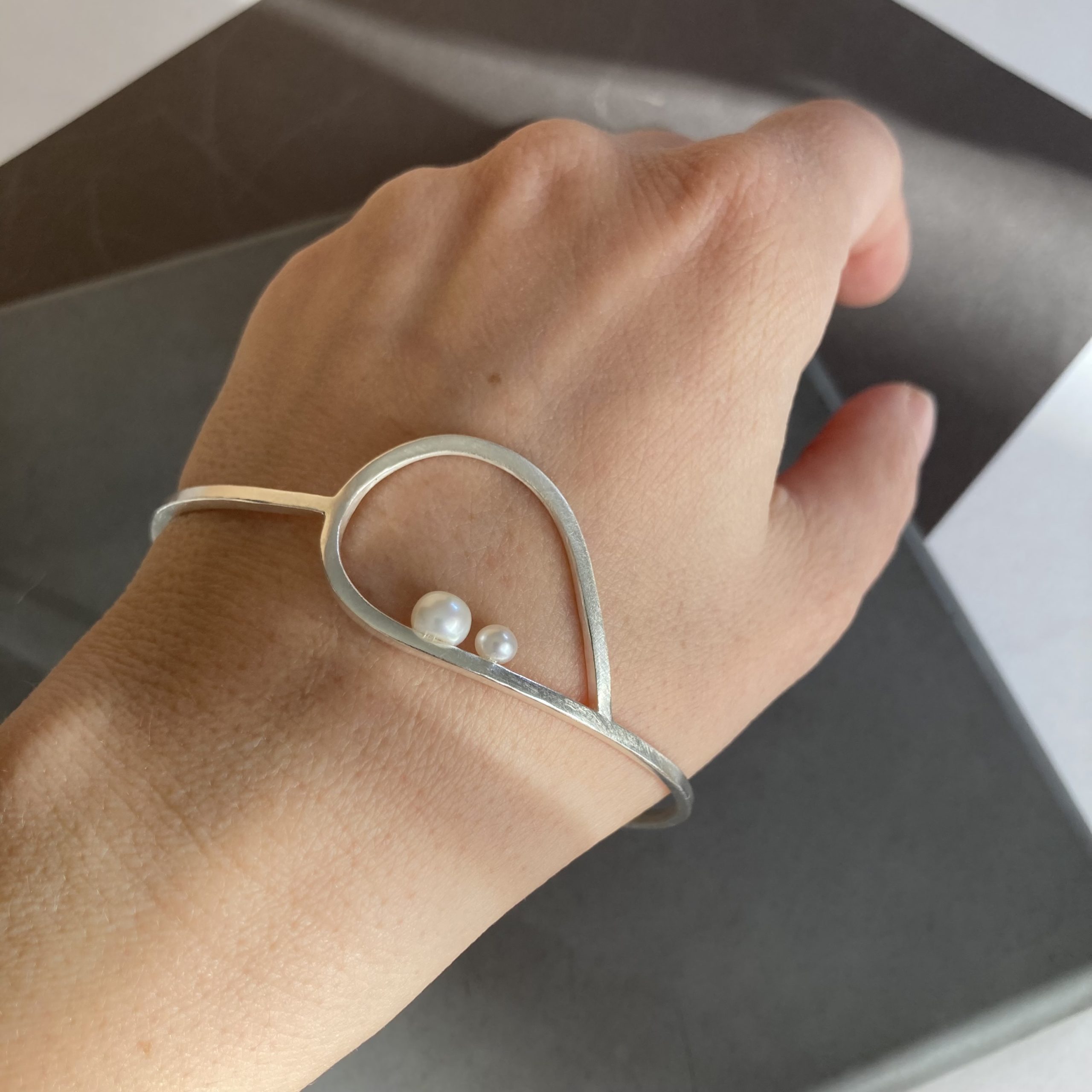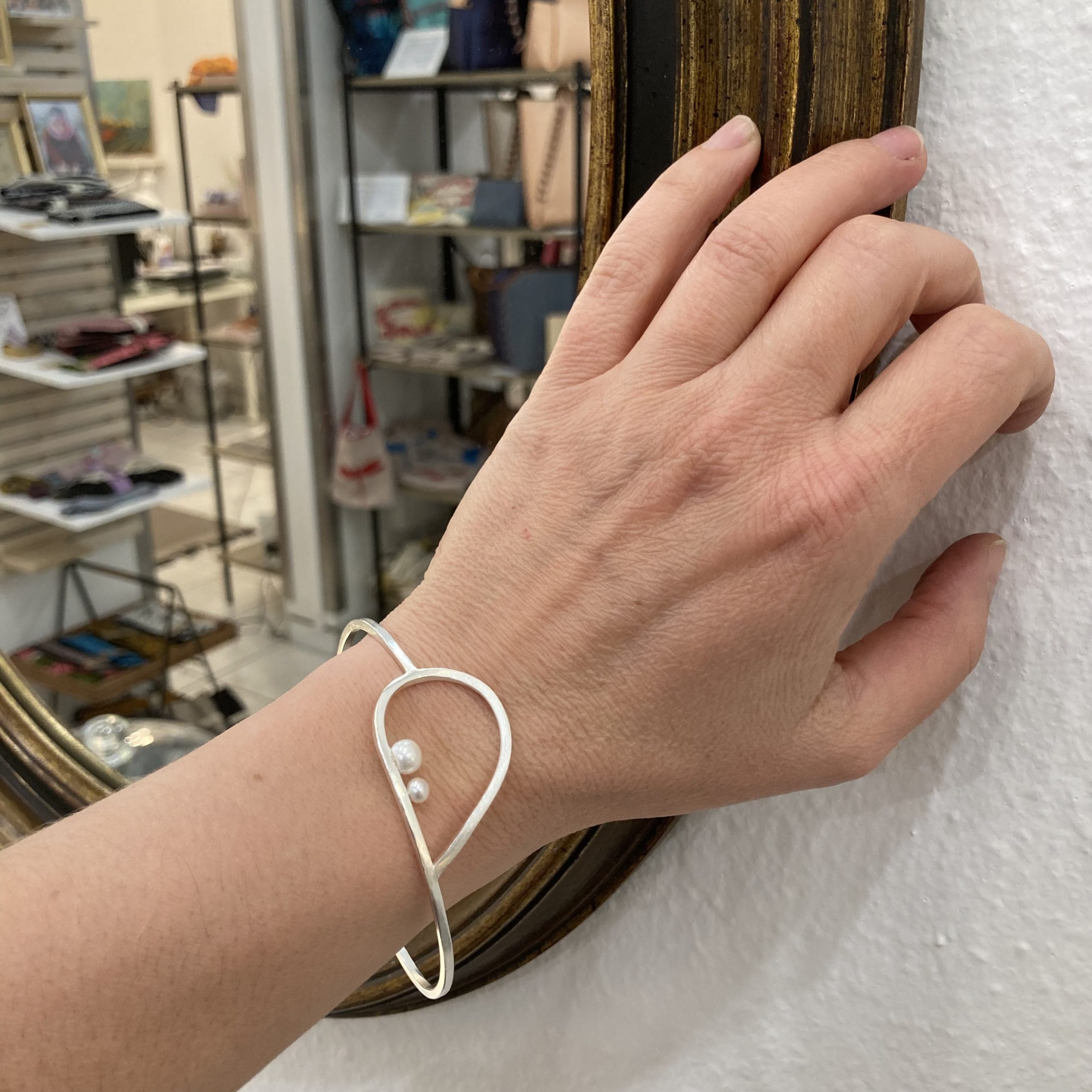 The bracelet is made of 2 mm square silver wire, decorated with white freshwater pearls inside the loop.