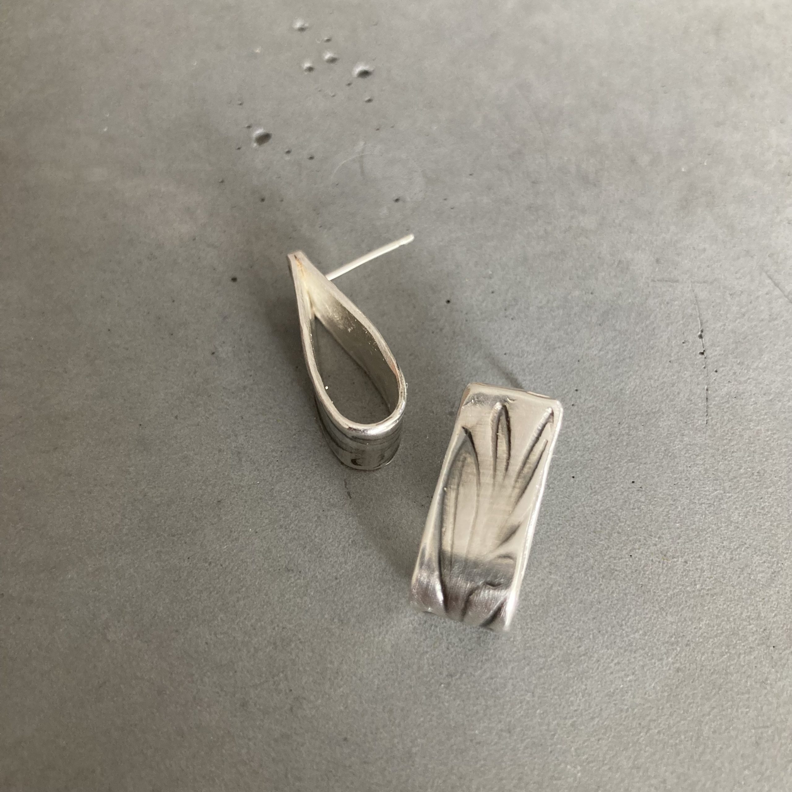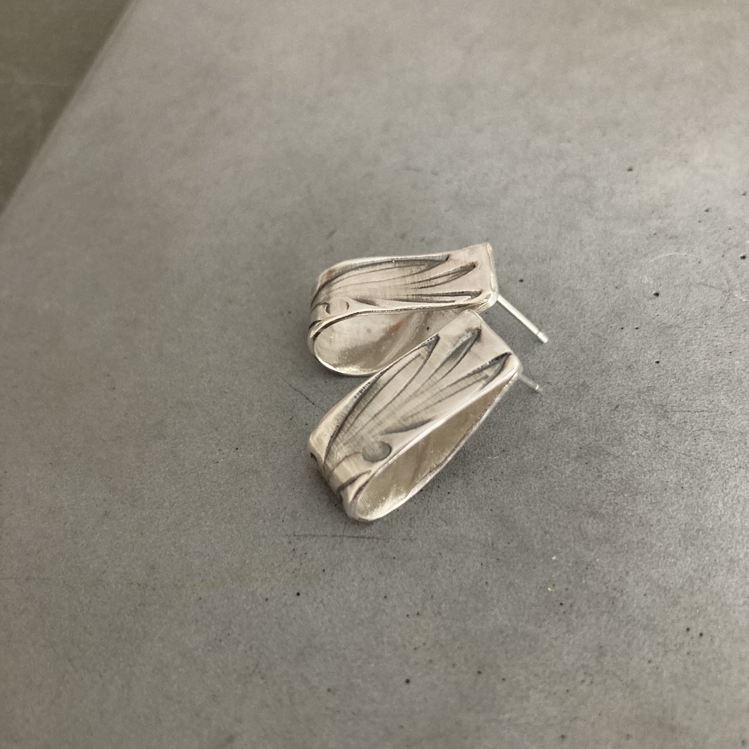 It is a distinctly eye-catching, drop-shaped 925 sterling silver earring, decorated with an olive leaf pattern.