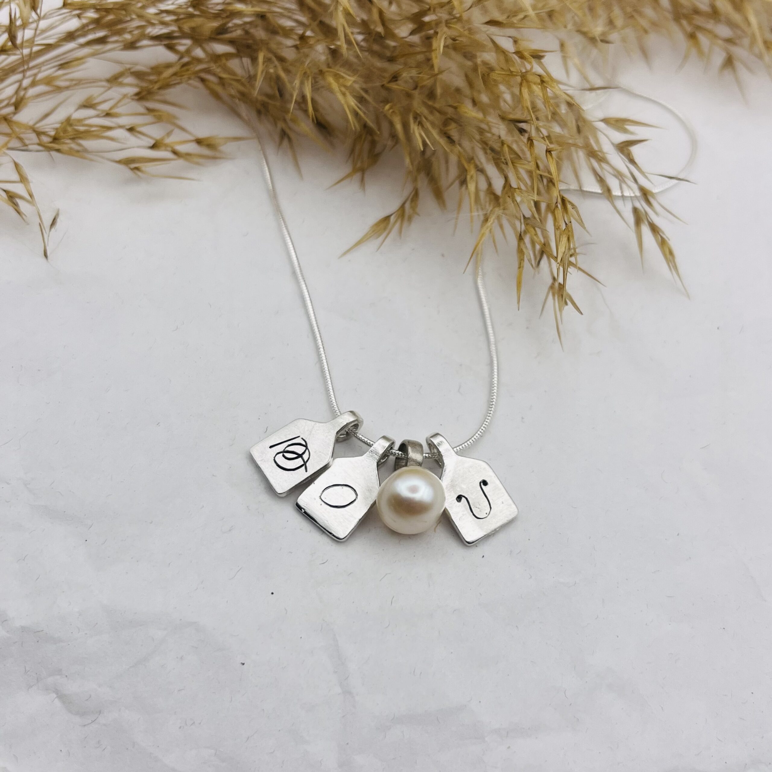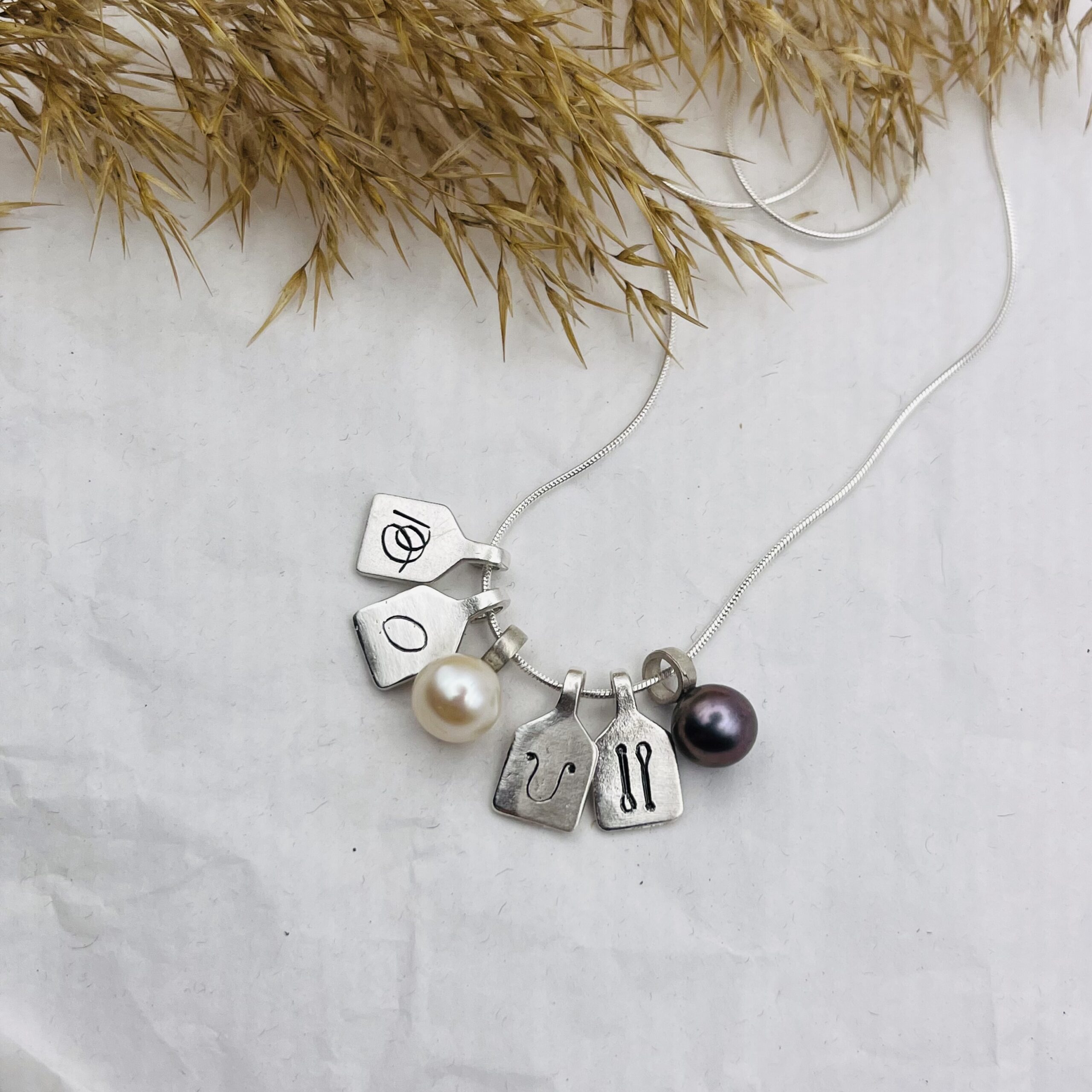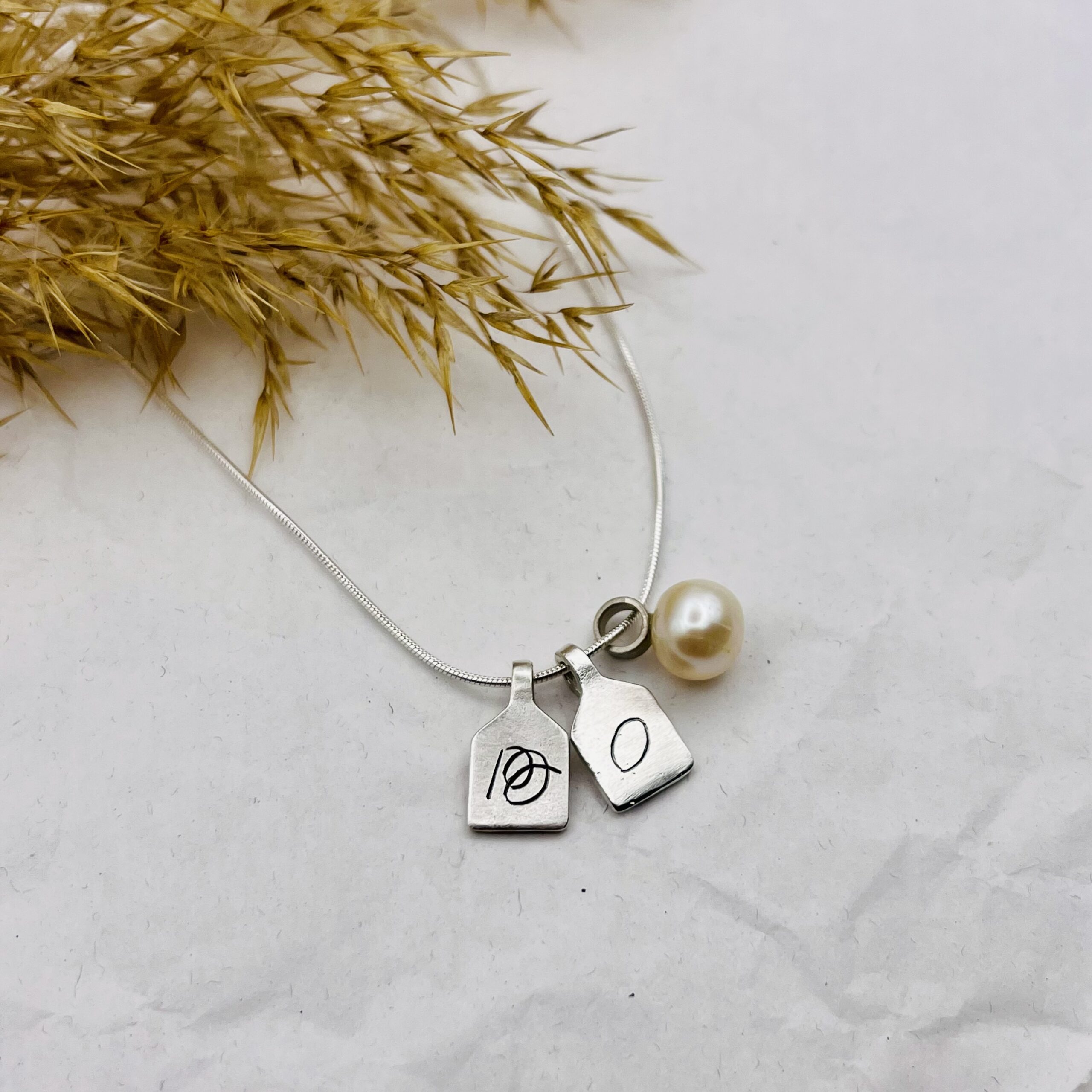 This customizable necklace is made of tiny 925 sterling silver “scoreboard” pendants and freshwater pearls.