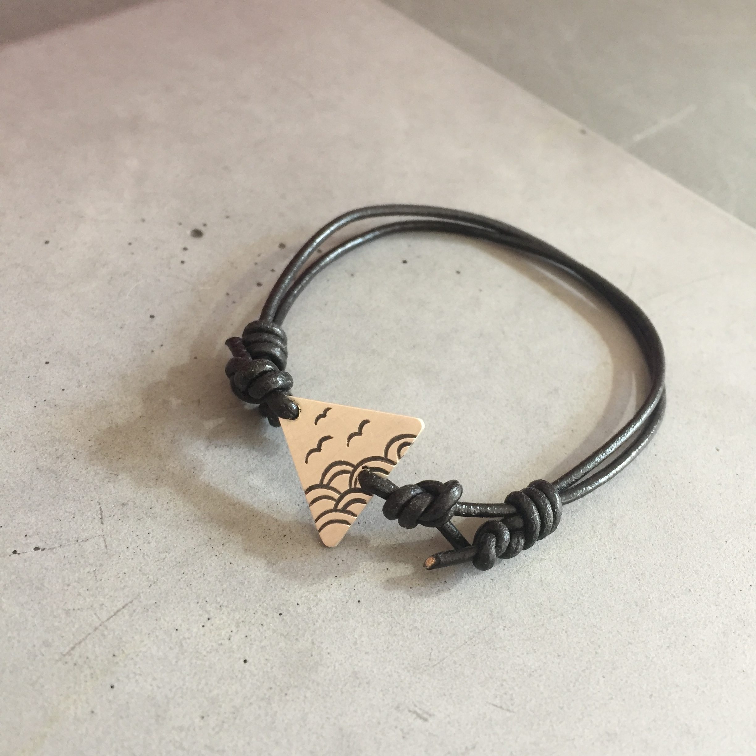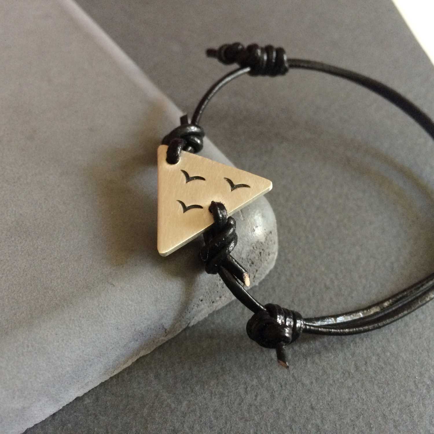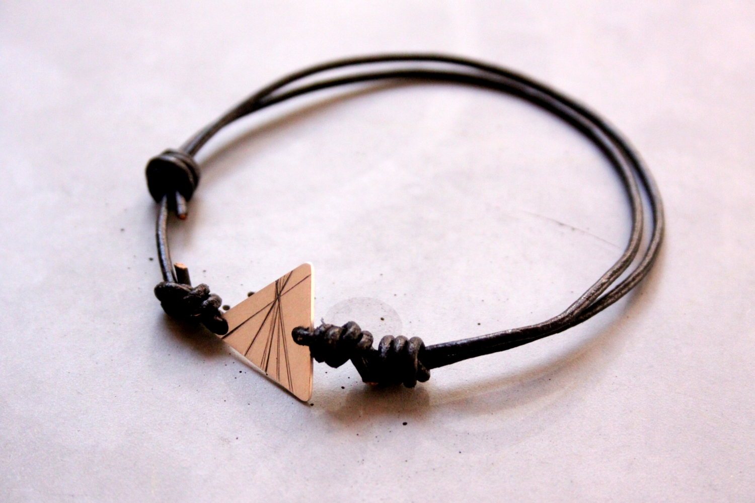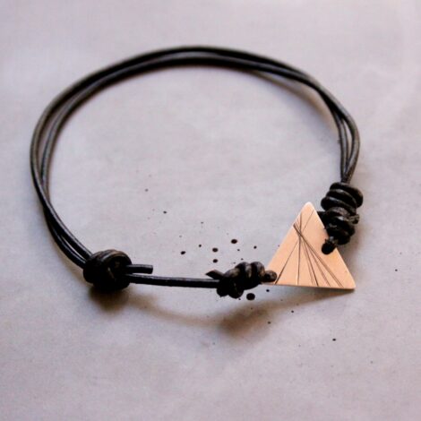 Silver jewelry for men: triangular bracelet with black lines combined with leather. The bracelet is adjustable.