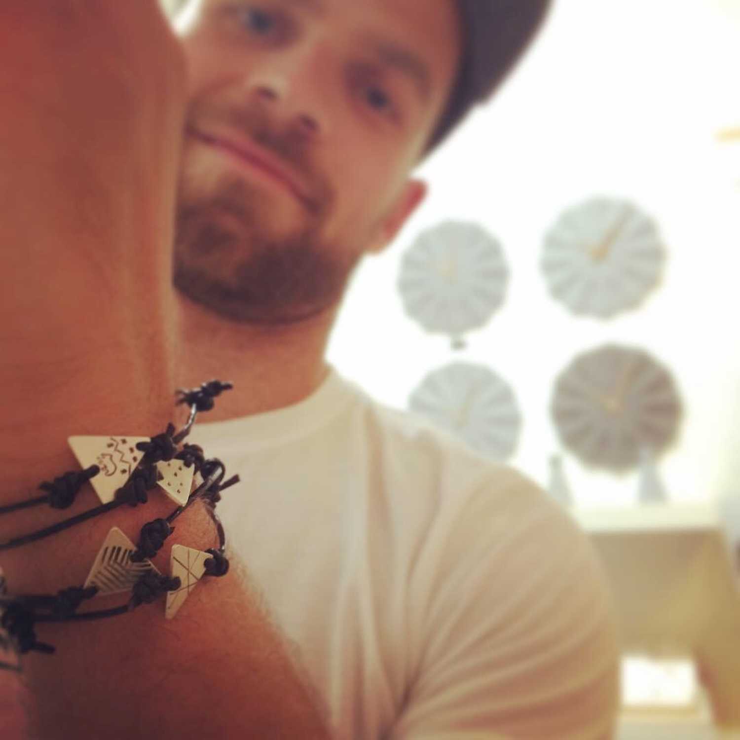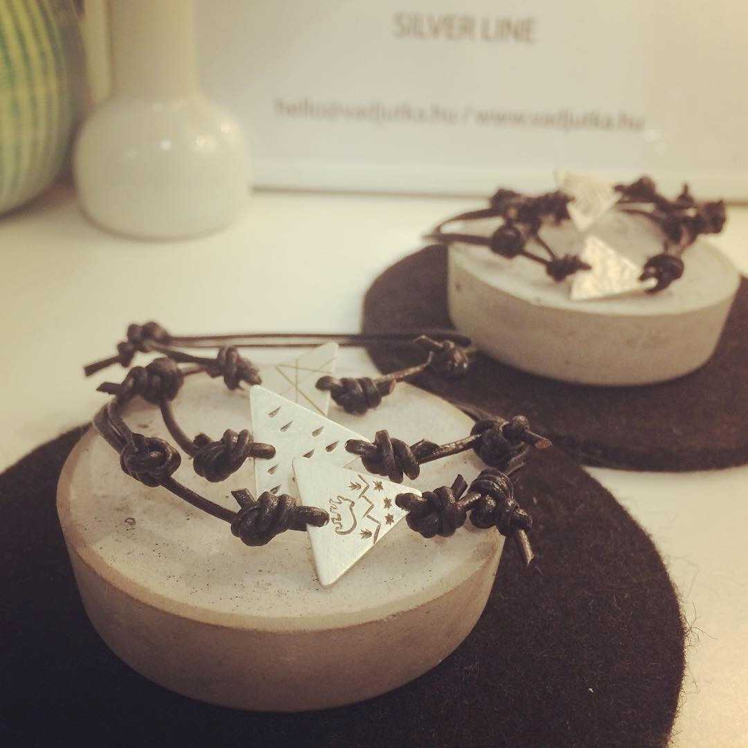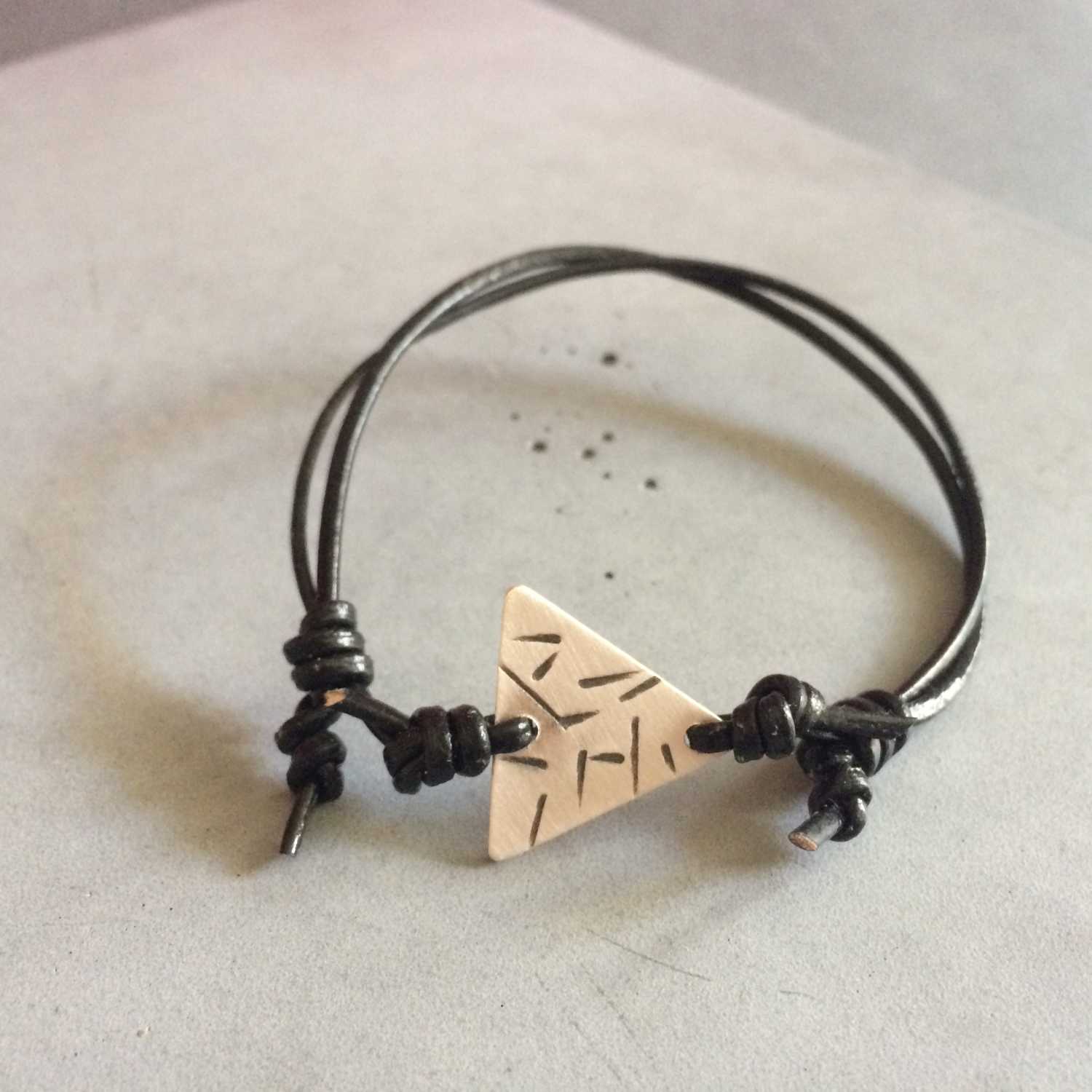 Silver jewelry for men: triangular bracelet with black lines combined with leather. The bracelet is adjustable.