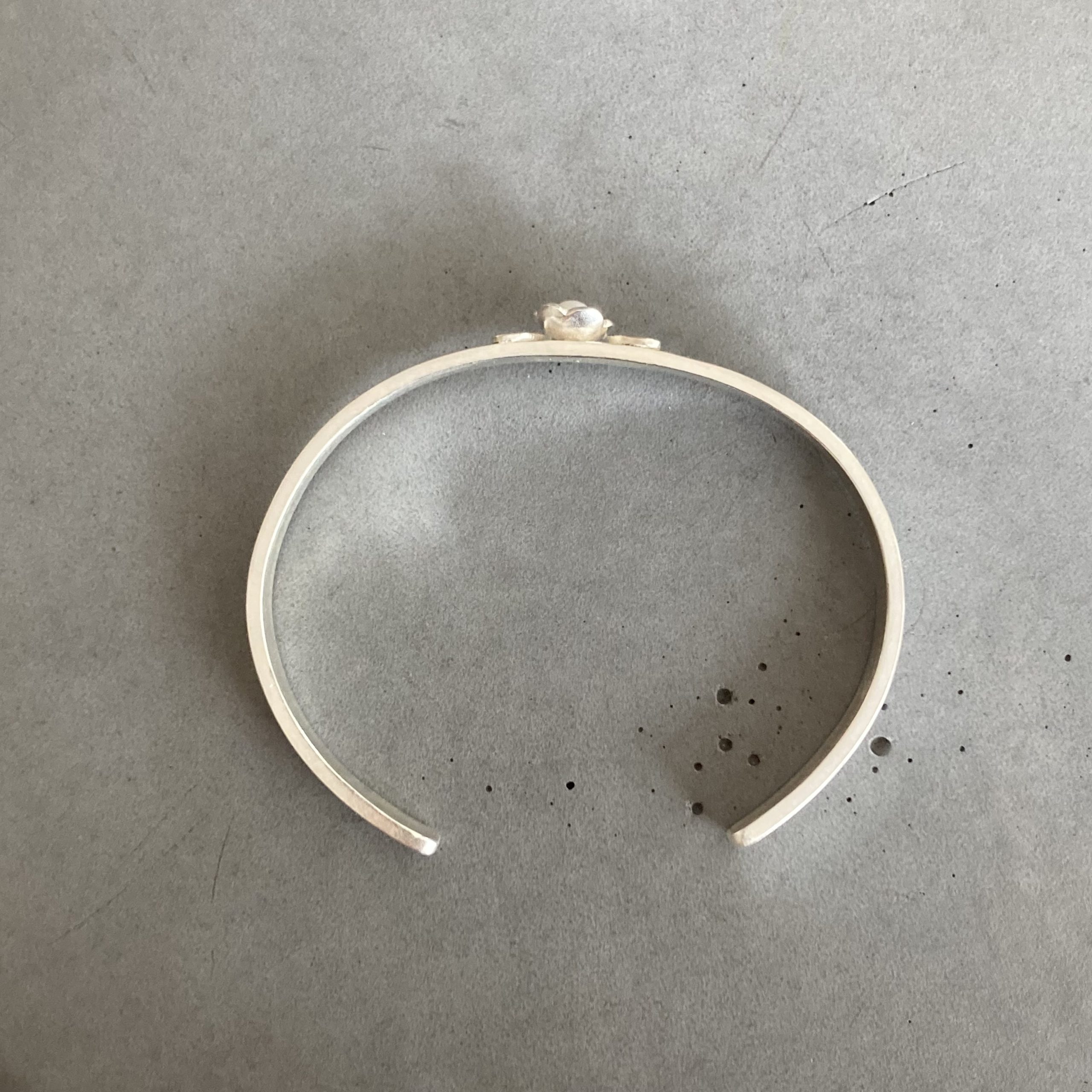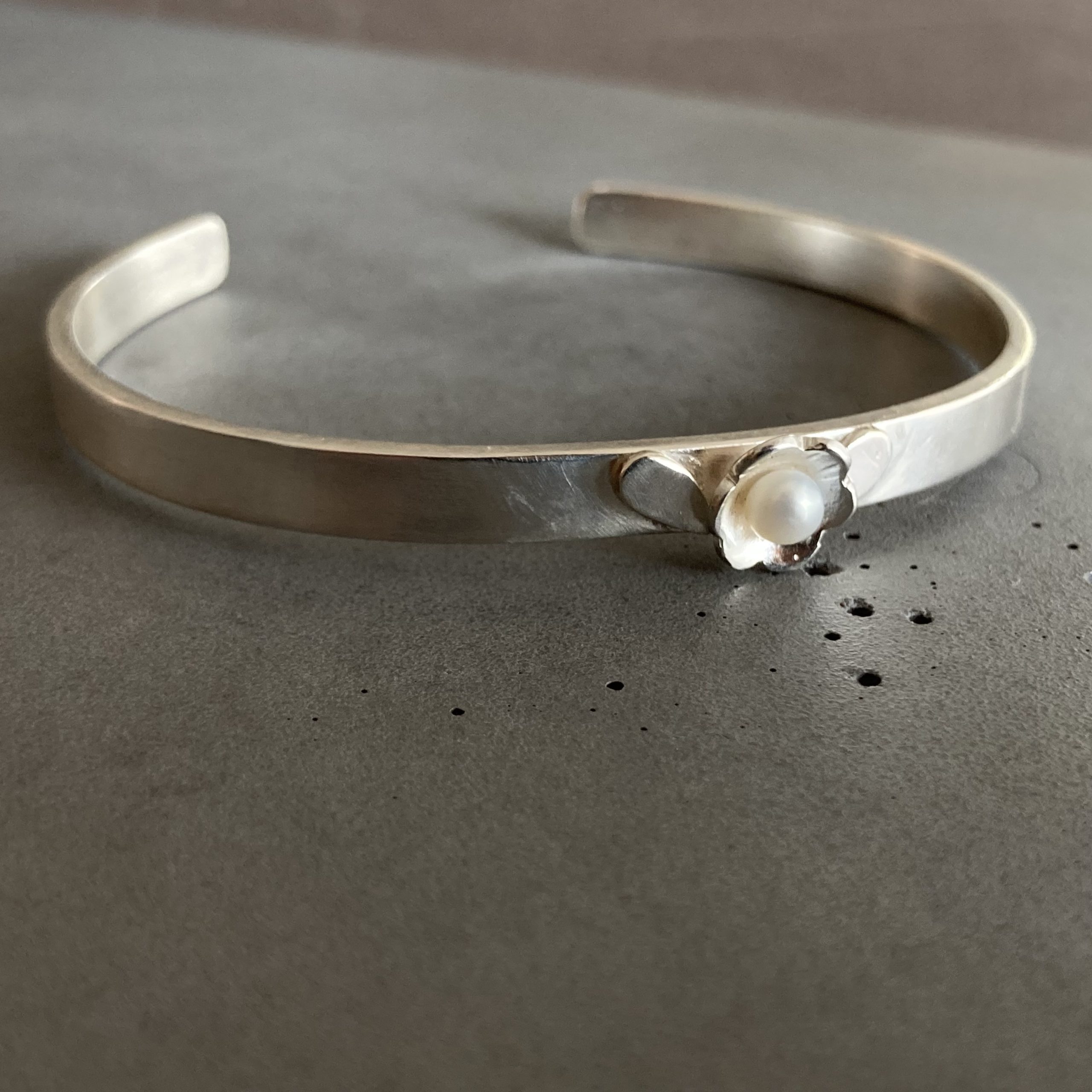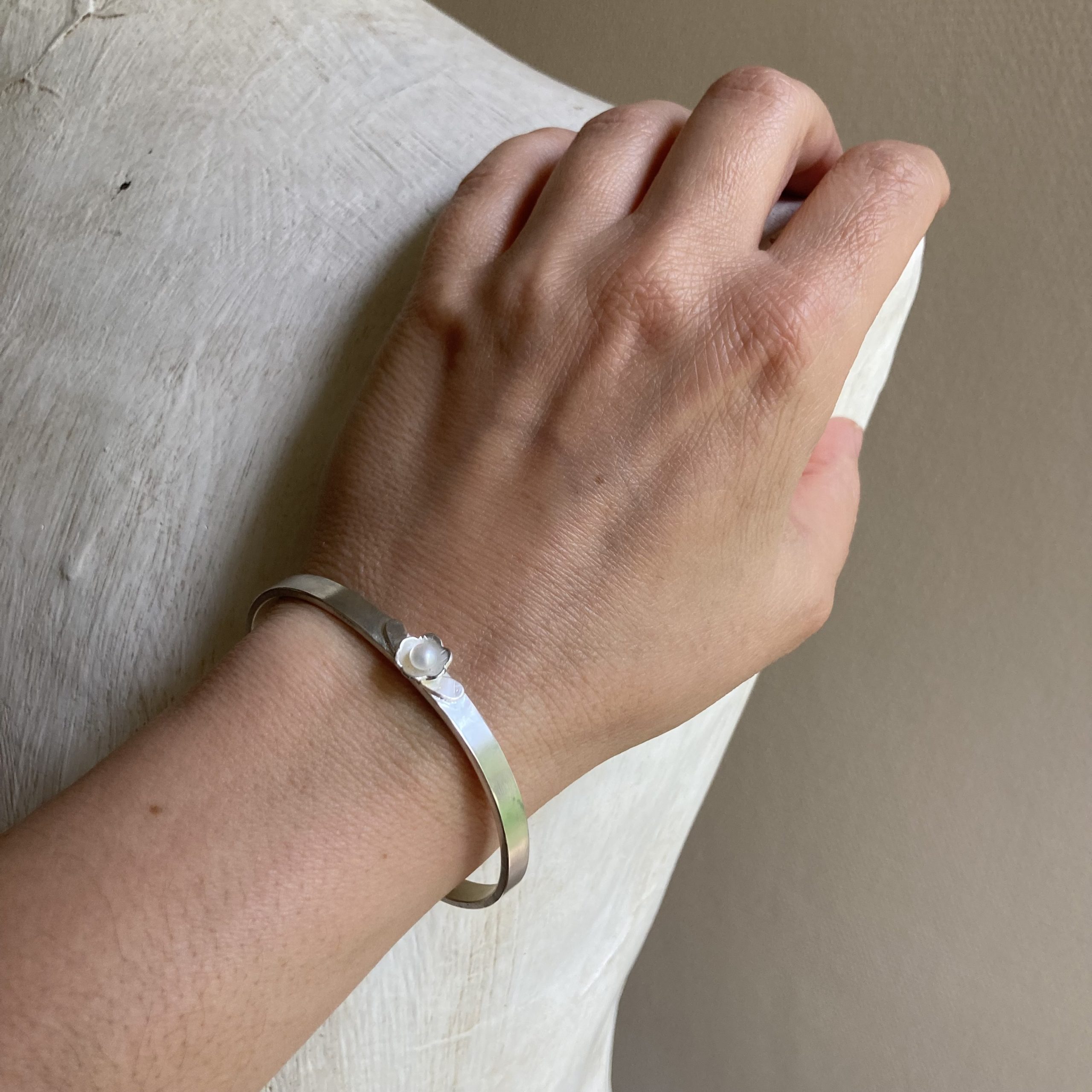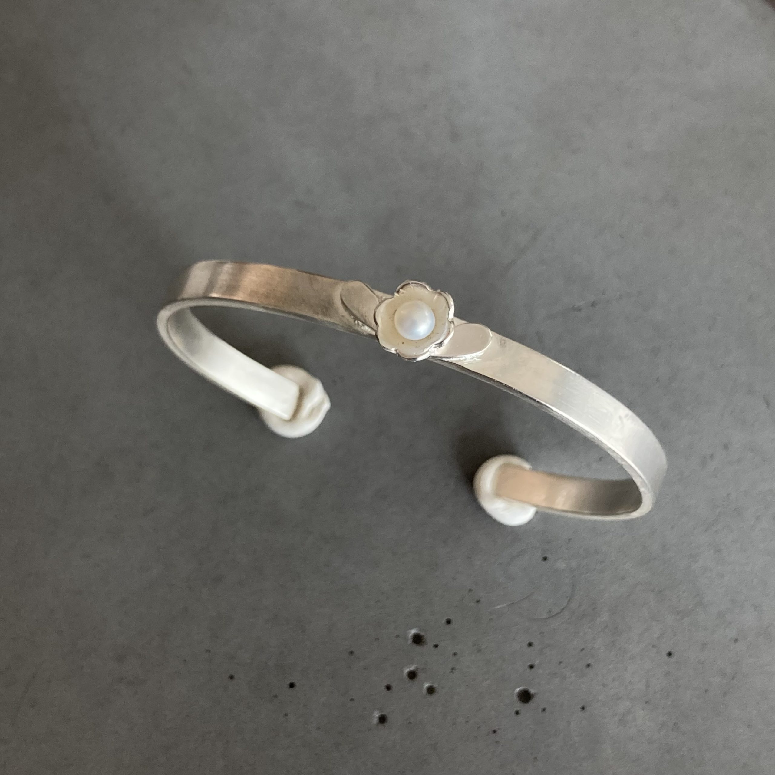 The bracelet is made of 925 silver with white freshwater pearls. The bracelet is 5 mm wide and 2 mm thick.