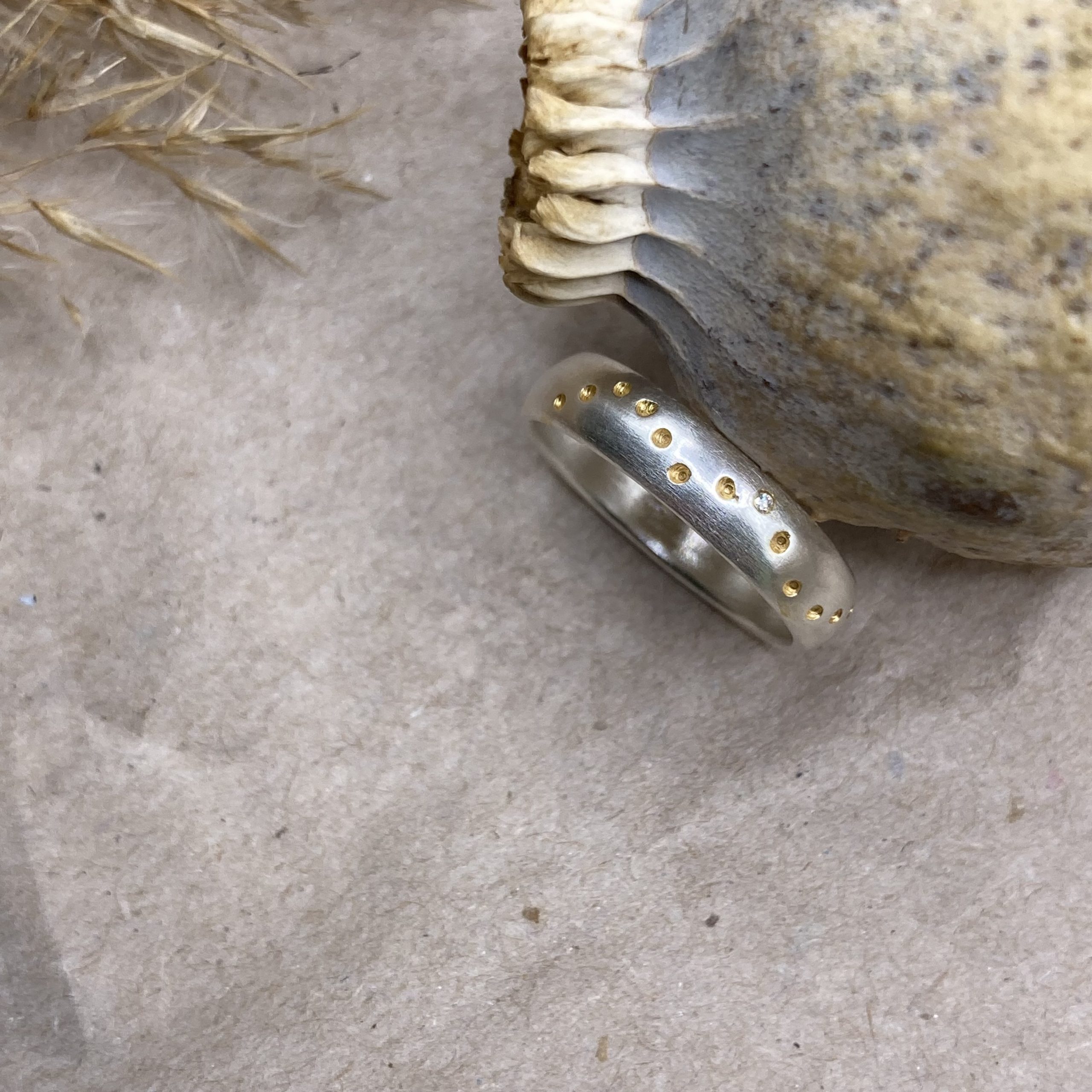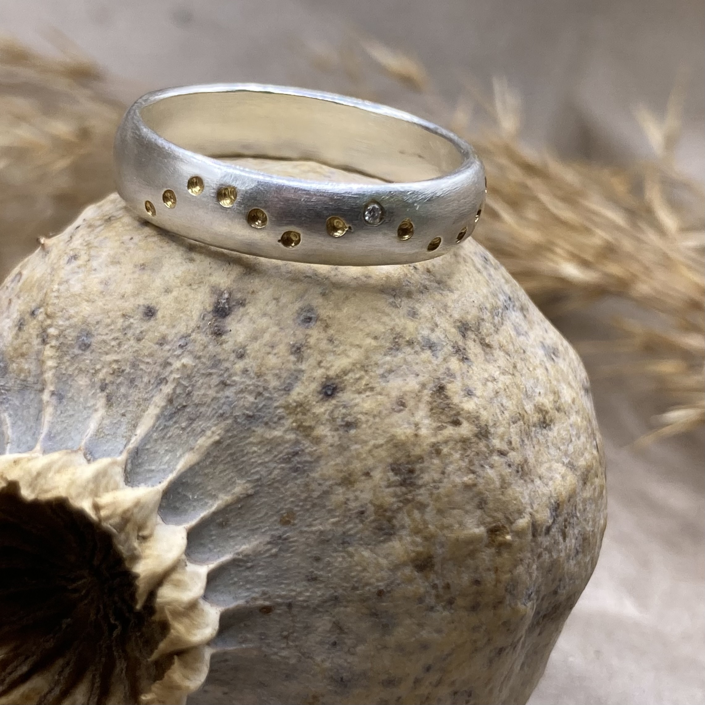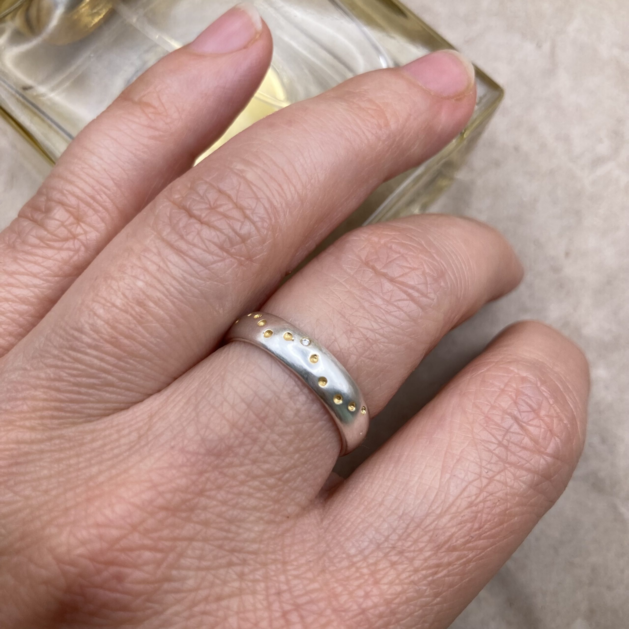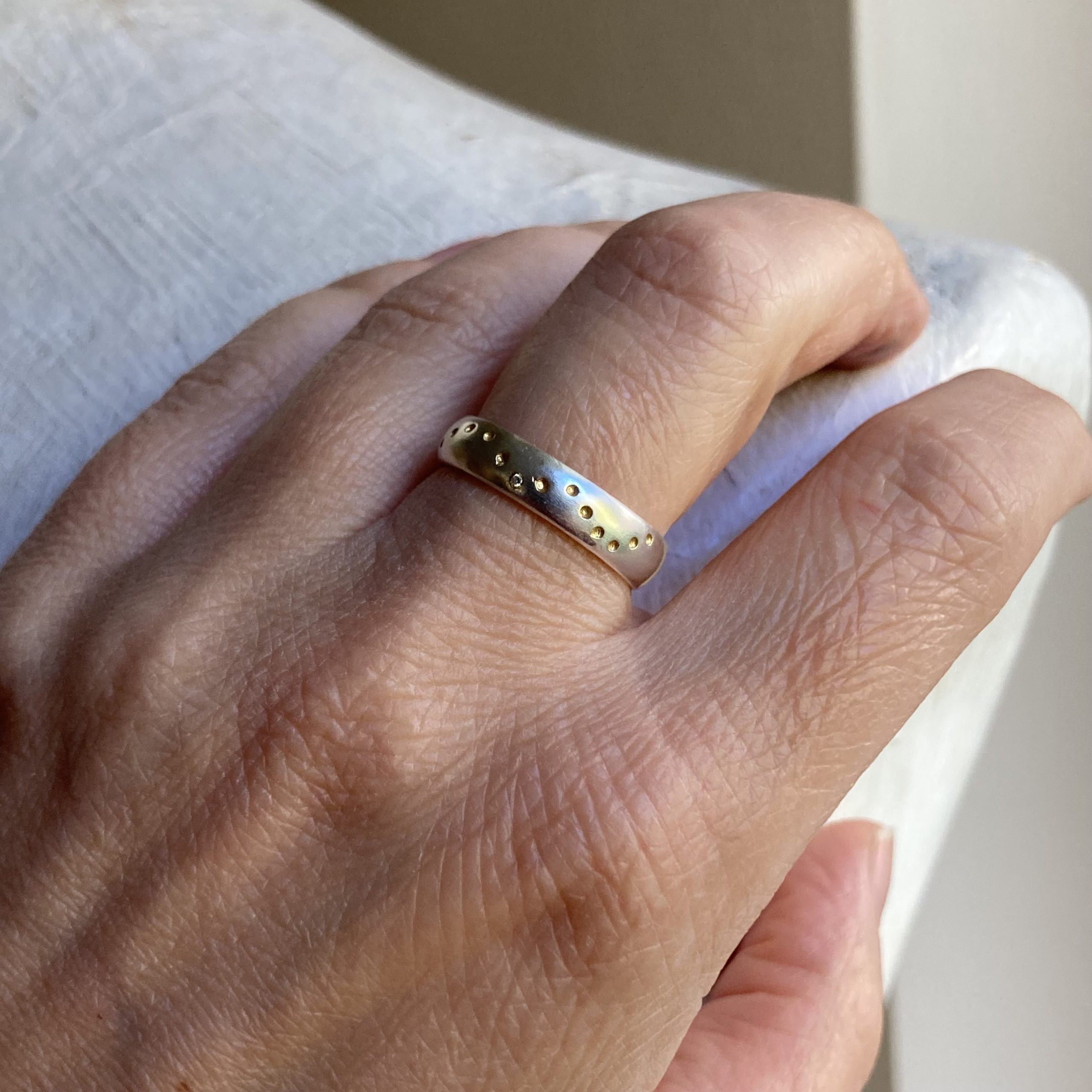 925 sterling silver ring with 14-karat gold-plated dots and a small white diamond.