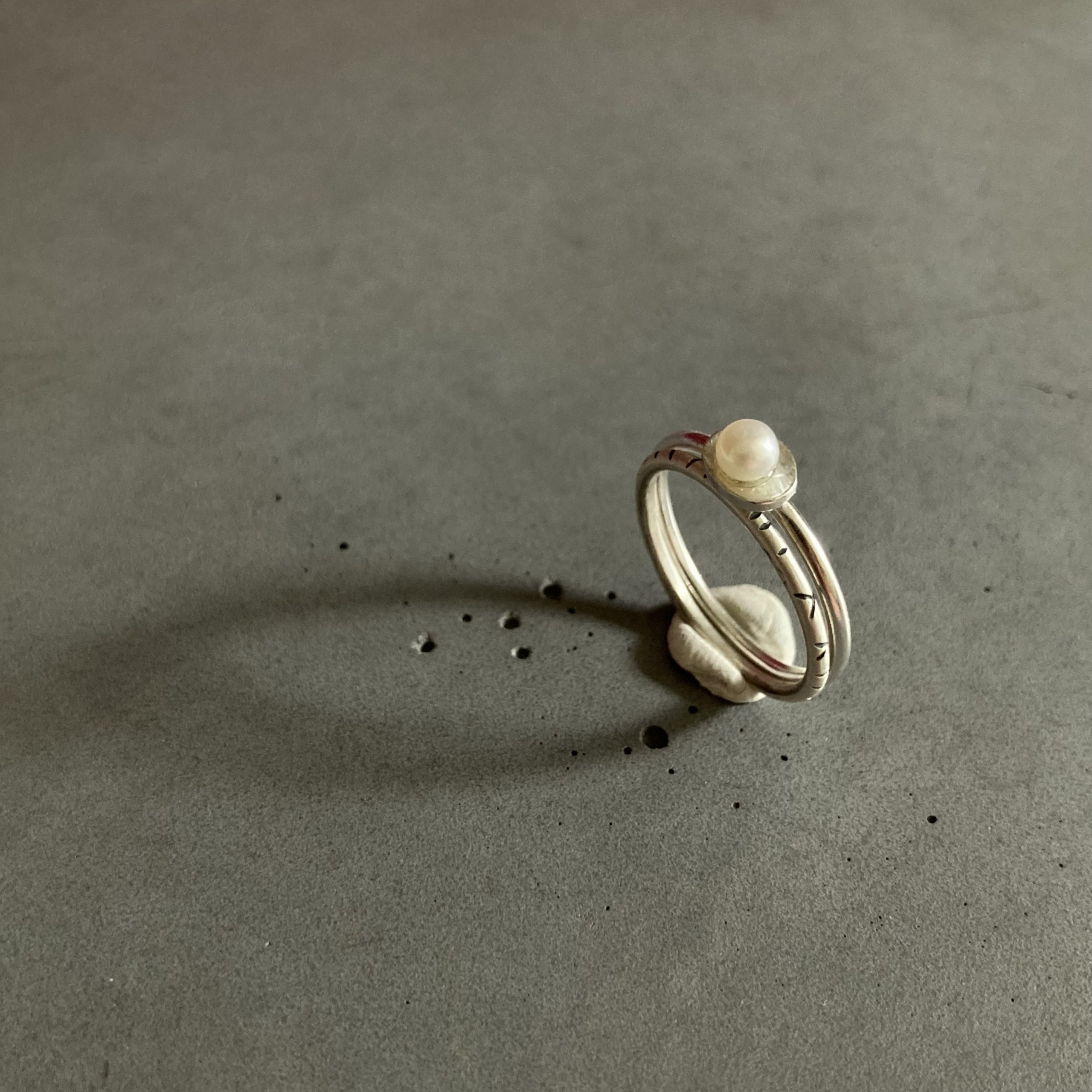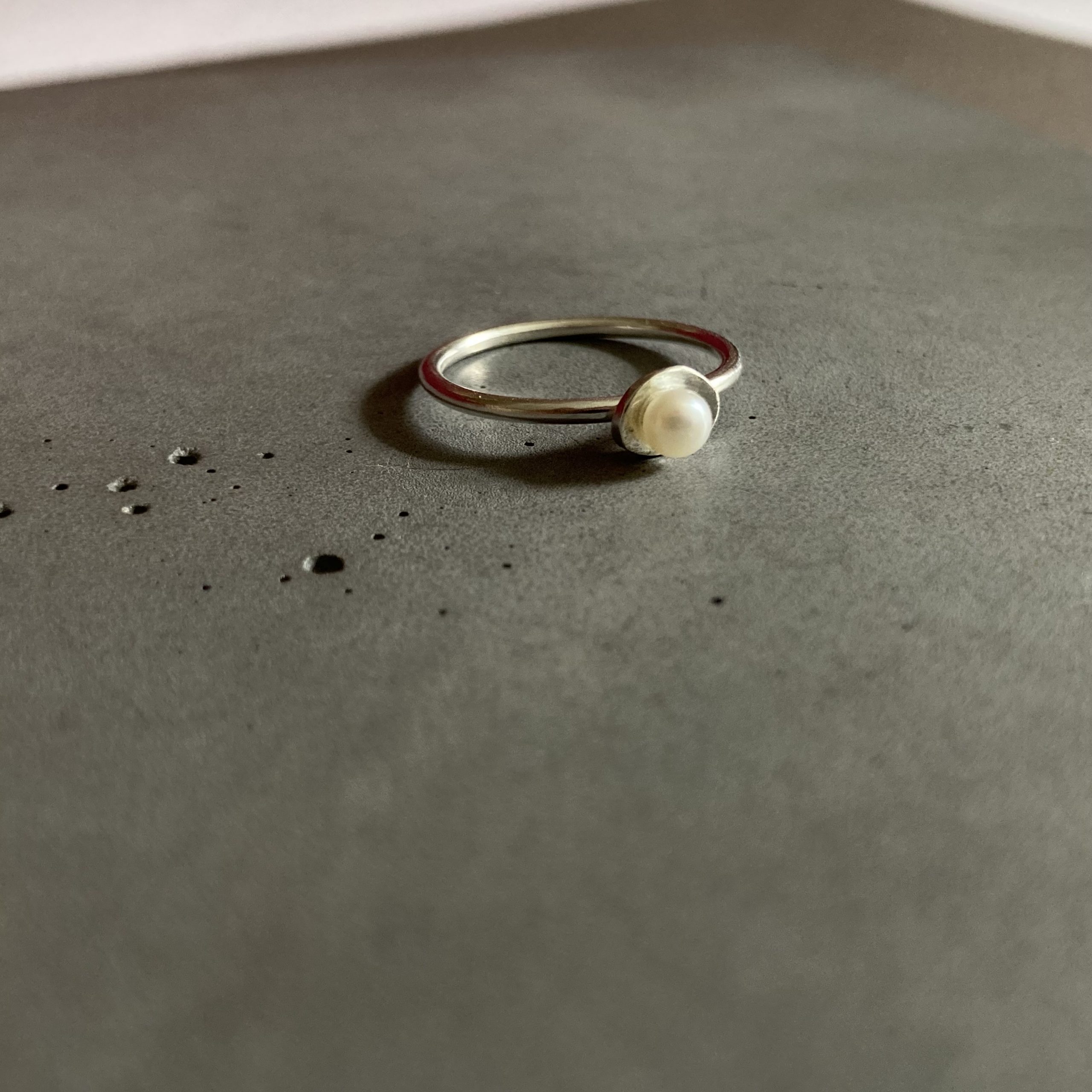 Tiny pearl: 925 fineness, 1.5 mm wide silver ring with a tiny white freshwater pearl sitting on a silver plate.