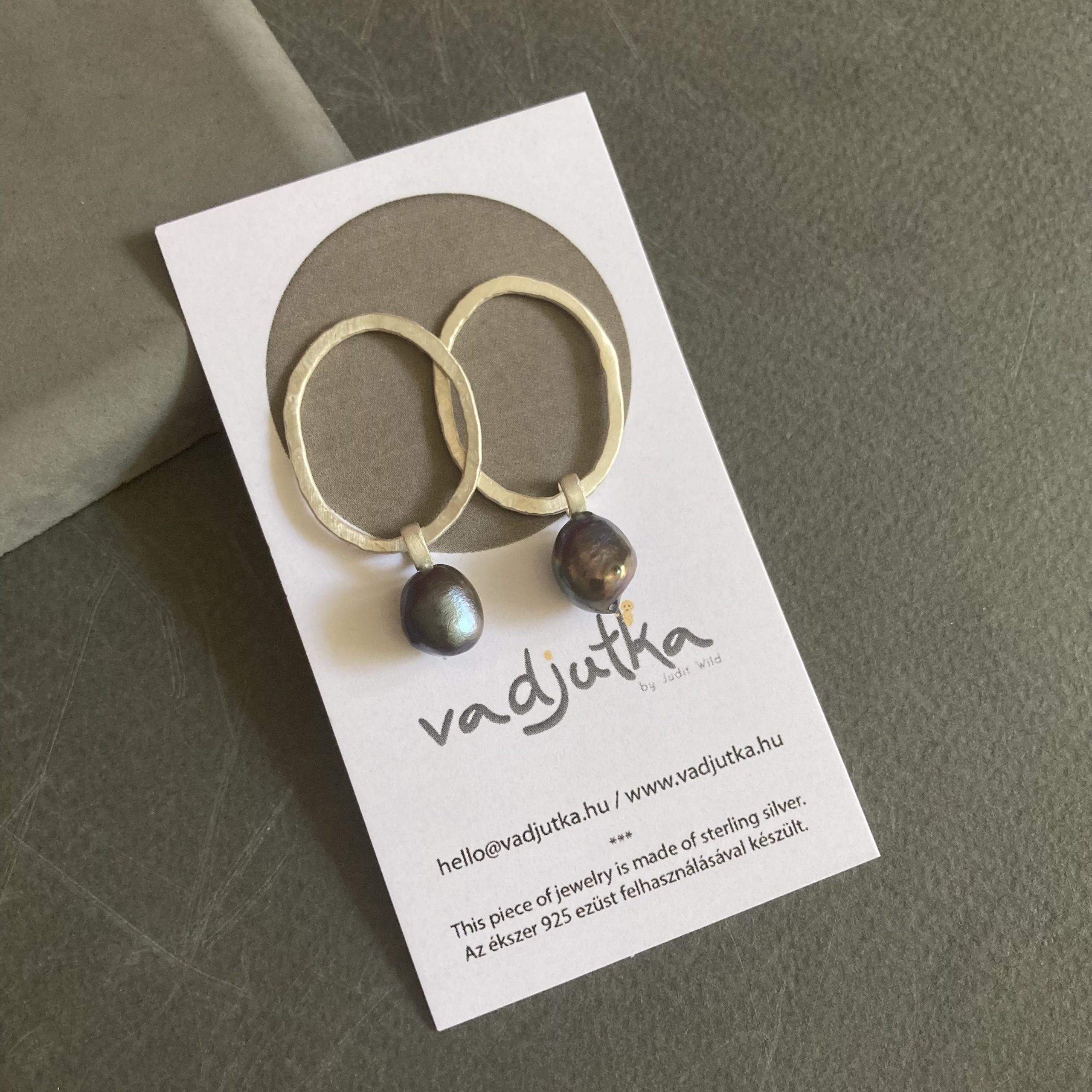 These amorphous silver stud earrings with dangling black pearls are exciting and playful (and large).