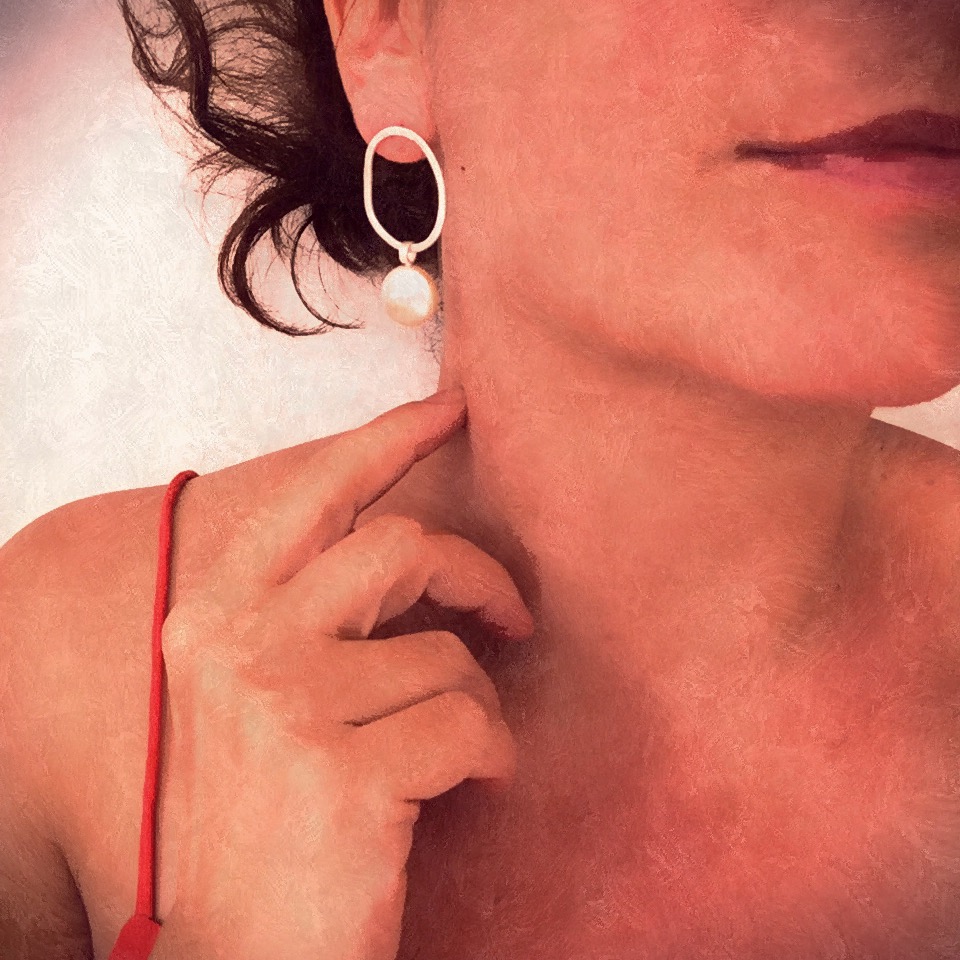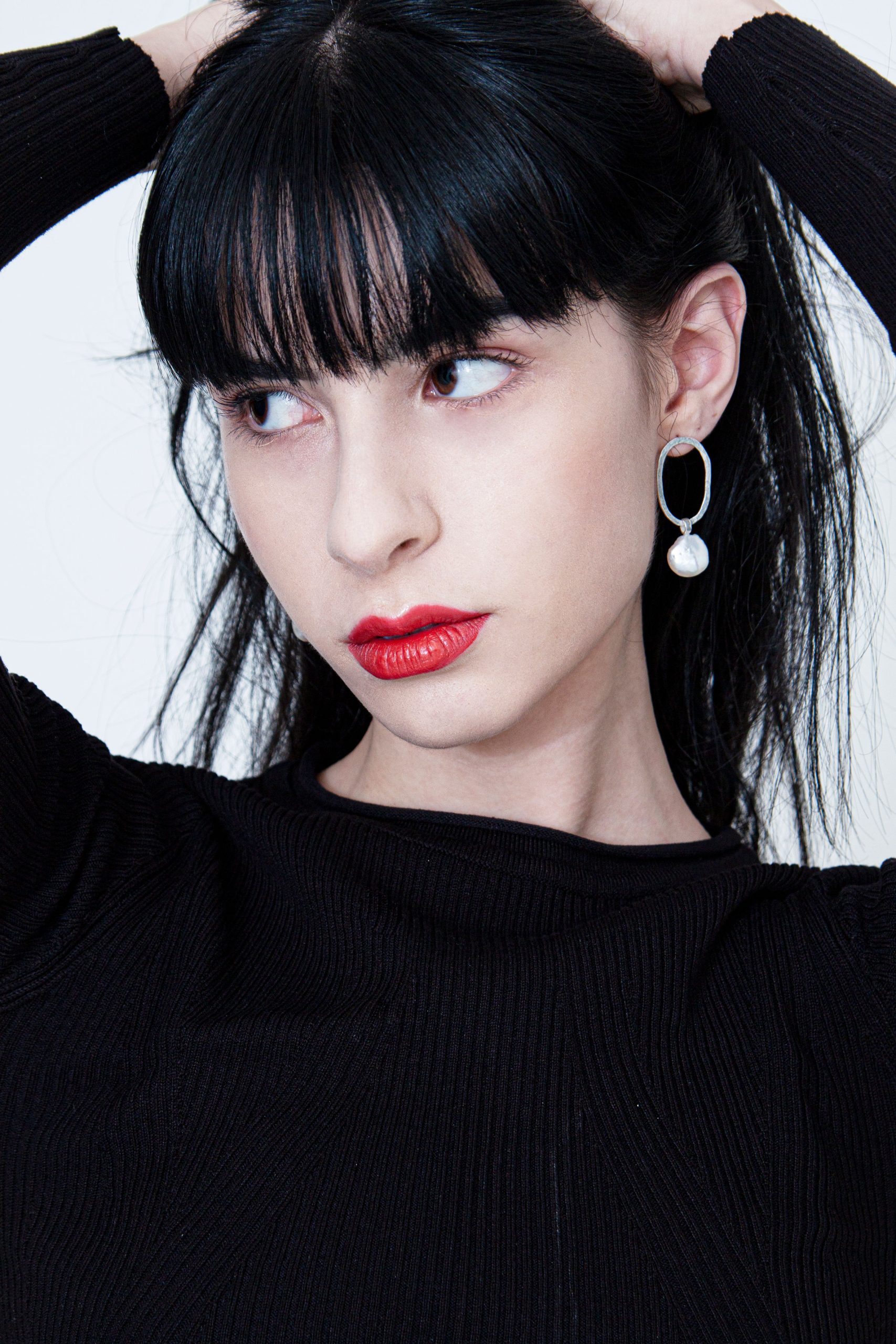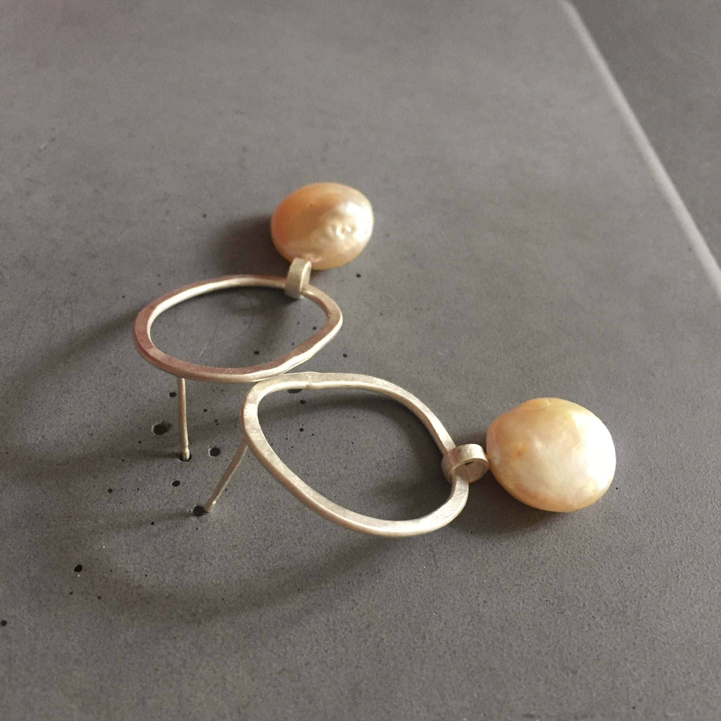 Swinging pearl – amorphous shaped silver earring with large moving pearl – designer jewelry