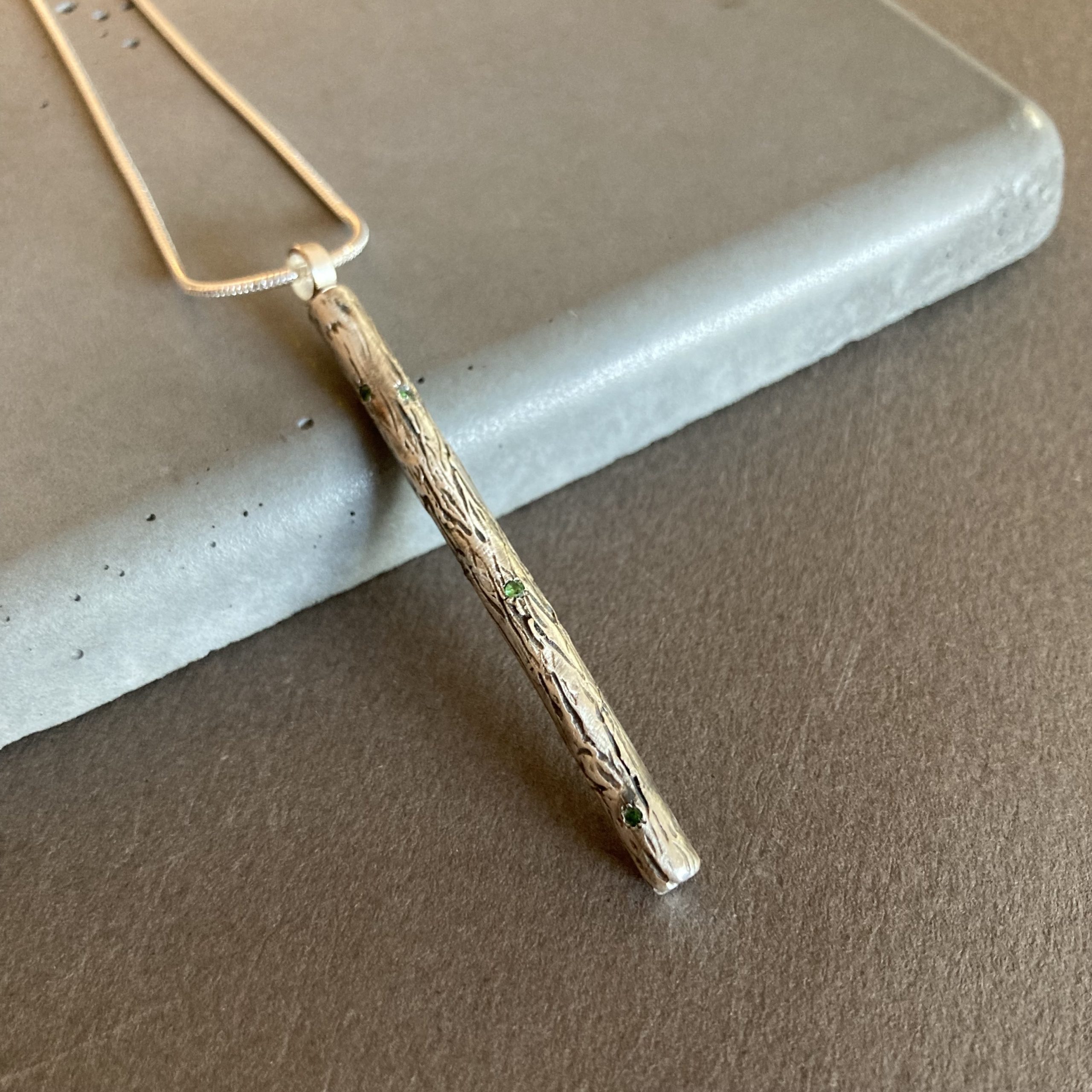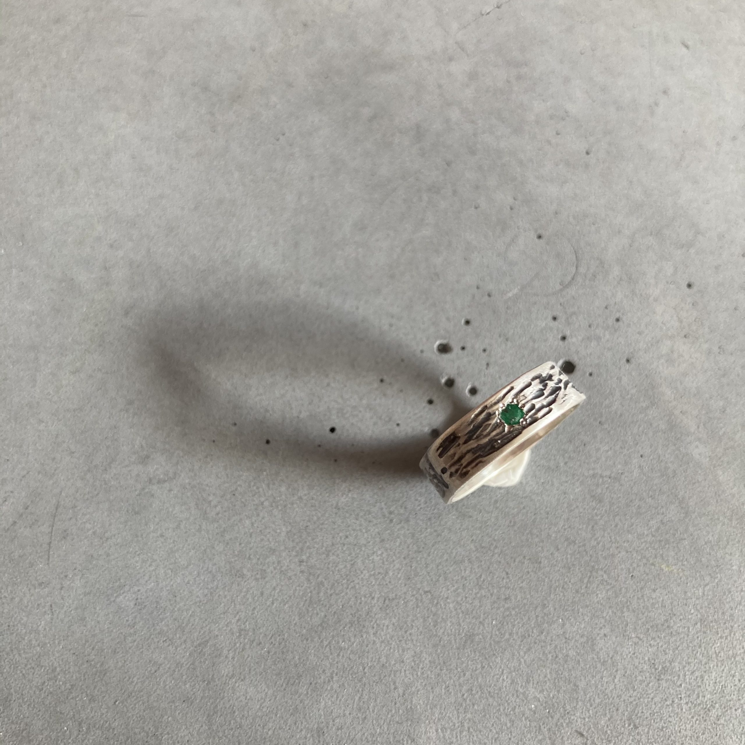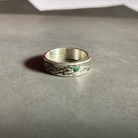 An exciting, rustic-looking silver ring with a larger emerald stone, resembling the grain of wood. (Other stones are also available; in this case, the price may vary slightly.)