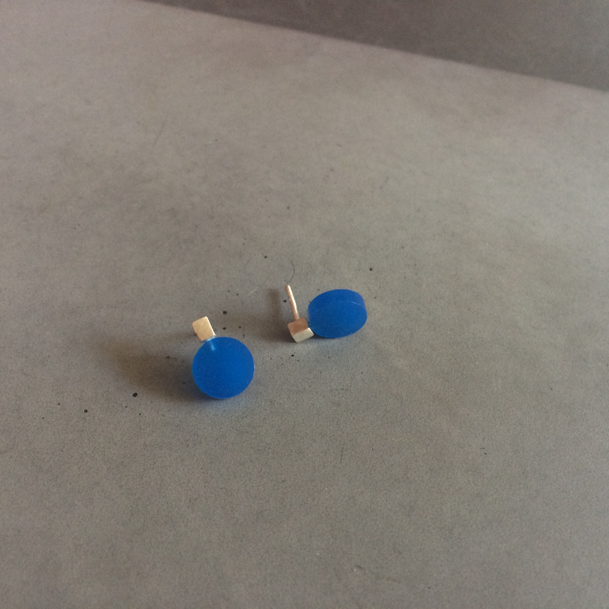 Tiny cube with blue circle – silver stud earrings with plexiglass – designer jewelry
