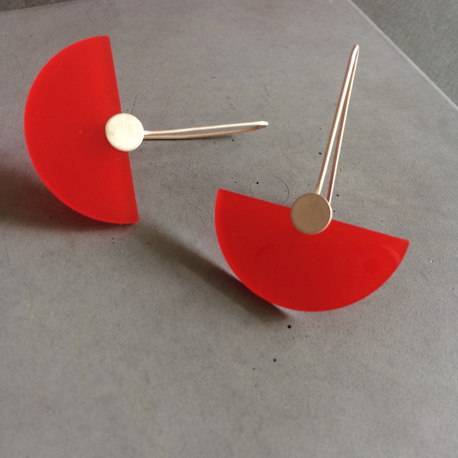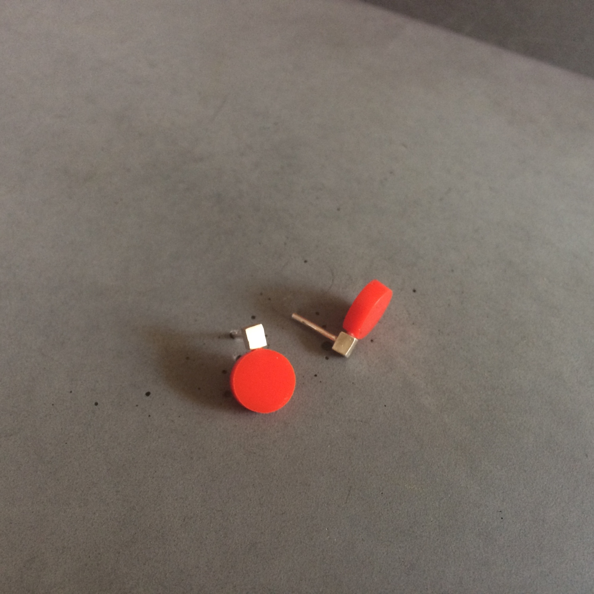 These earrings are made of 925 sterling silver with red plexiglass and a tiny silver cube.